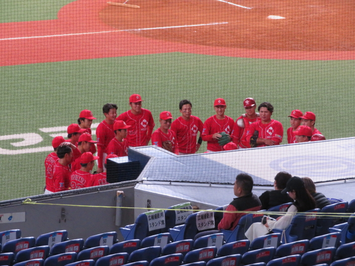 ~関西学生秋季リーグ・三節(南港中央)~ 今日の南港は、終始曇天、ときたま少雨、それにかなりの強風。 ① 同大 7-1 近大 同大4回7番C星加(今治西4)、5回4番CF杉浦(大谷4)の2ランなど で先勝 !! 台風の影響でこのままずんずん風が強くなれば、ニュートラムの 運休も想定されるから、落ち着いて観戦できず !! |