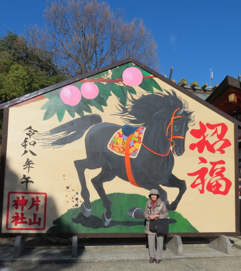 ~R5年の初詣・片山神社~ 元旦の初日の出は、生駒山脈上の薄雲が切れないまま昇る。 参拝者が年々少なくなっているのか、スムーズに拝殿へ着く。 今年こそ、新コロナの終息を祈願しつつ。 大絵馬の前では、見知らぬご家族の依頼でシャッターマンに変身 !! |