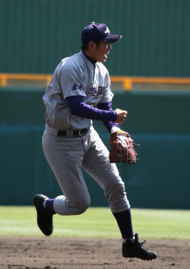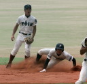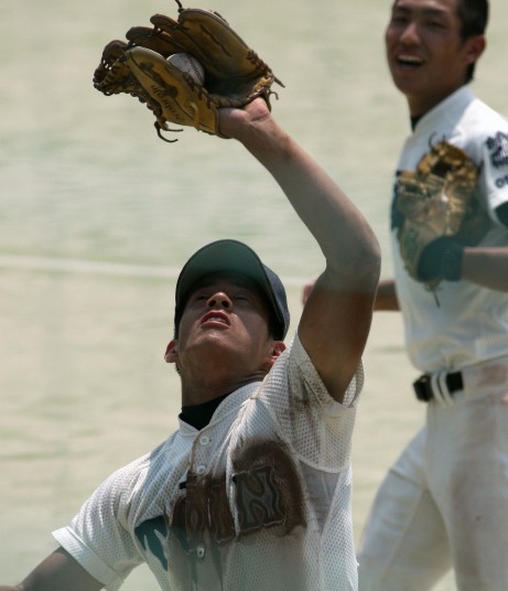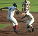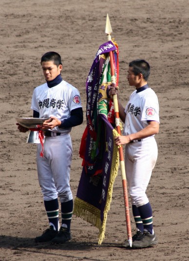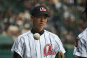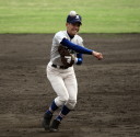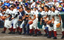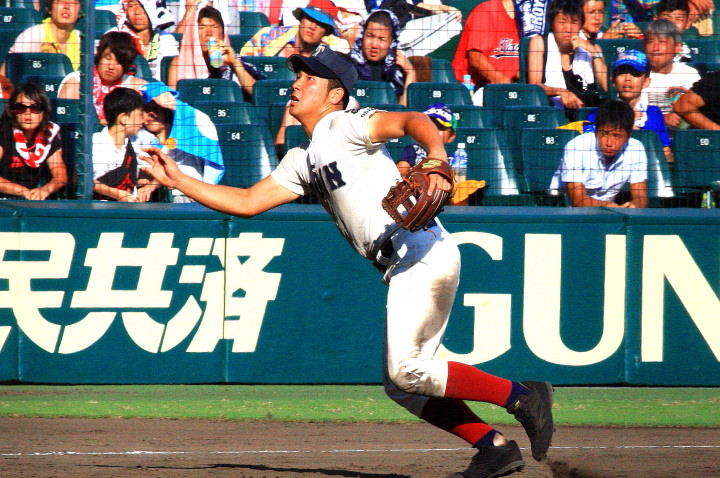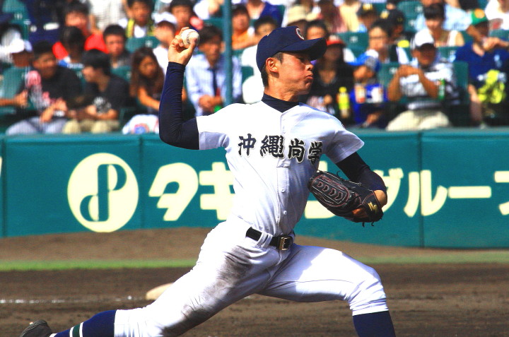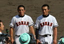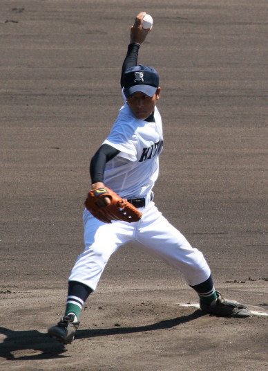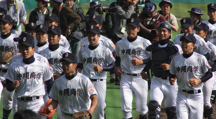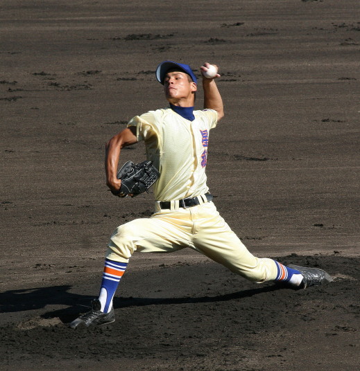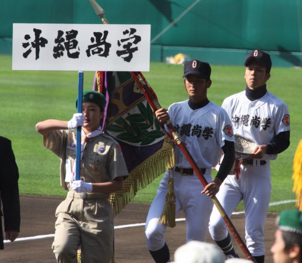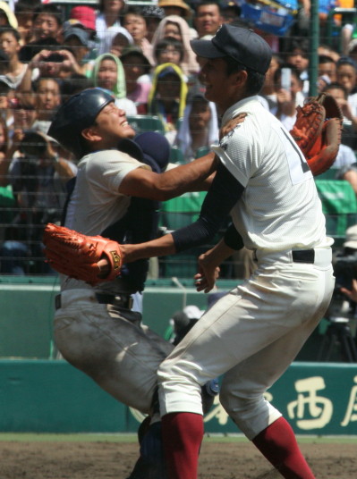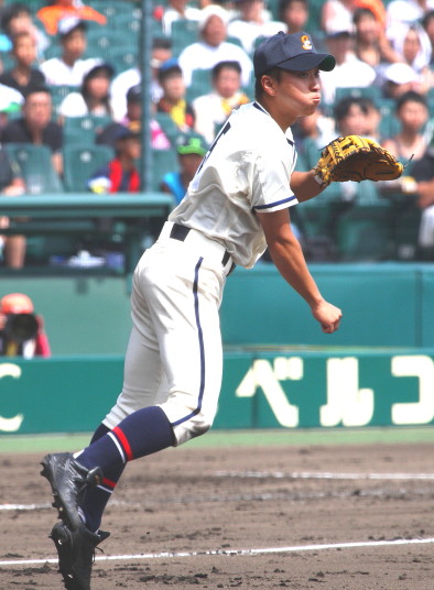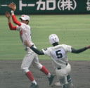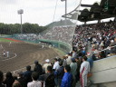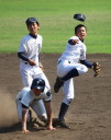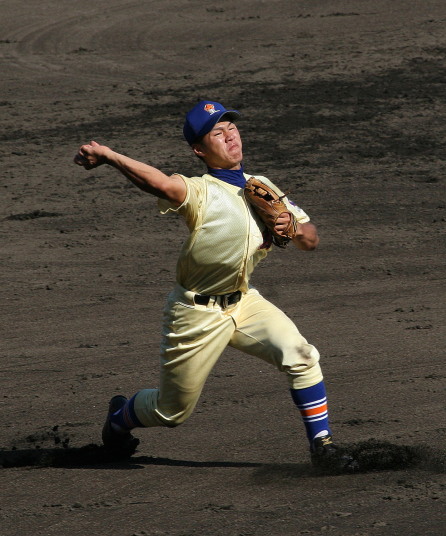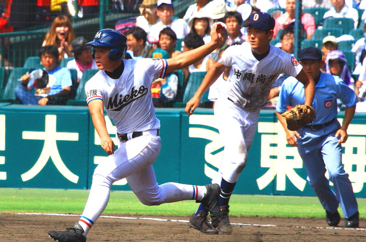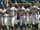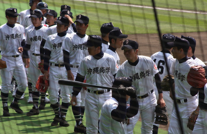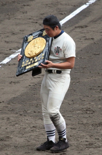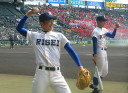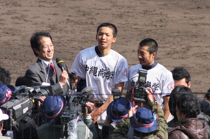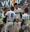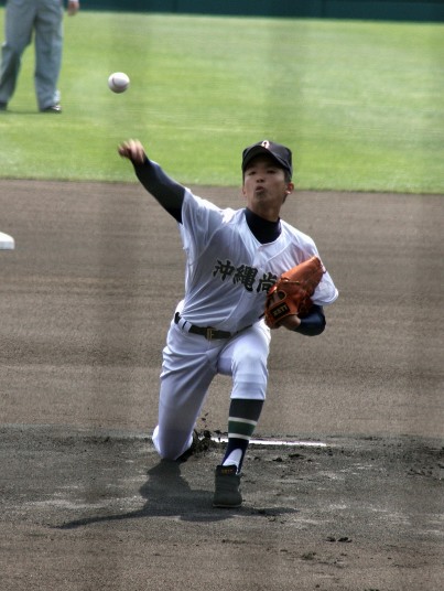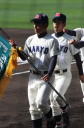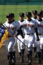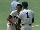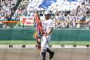 | 好カードの第2試合は予想通りの展開になった。 6回沖縄尚学は押し出し四球と相手エラーで同点に追いつき、 7.8回に福知山成美のエース仲村渠(なかんらかり)を攻めて逆転、 9回の福知山成美の猛追をかわし1点差で逃げ切った。 |
