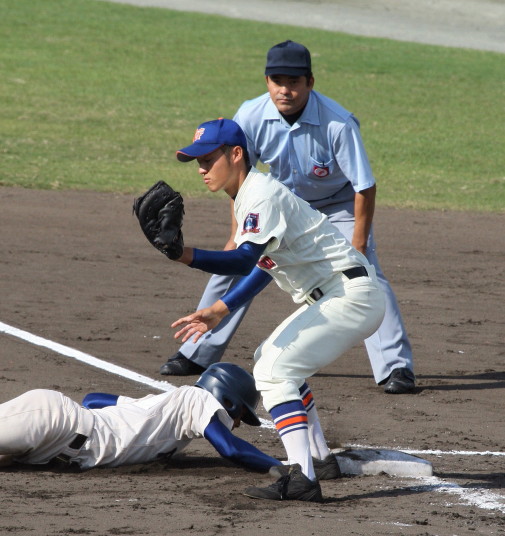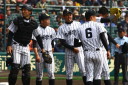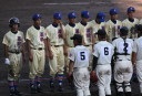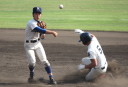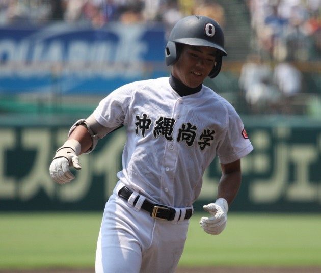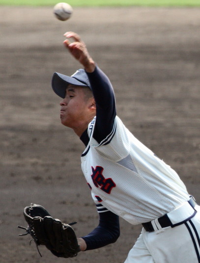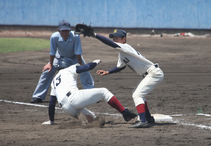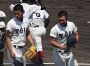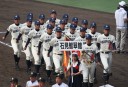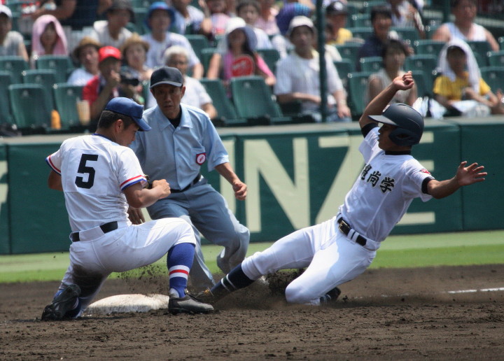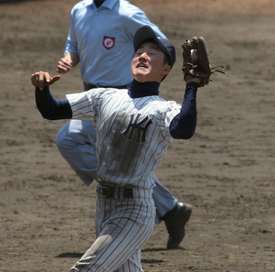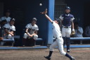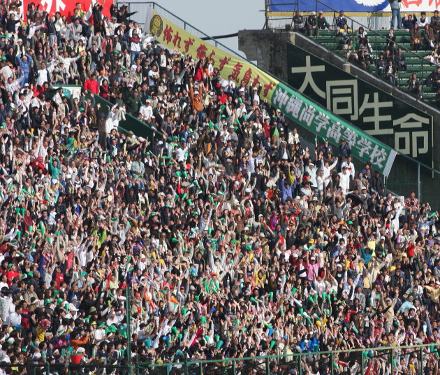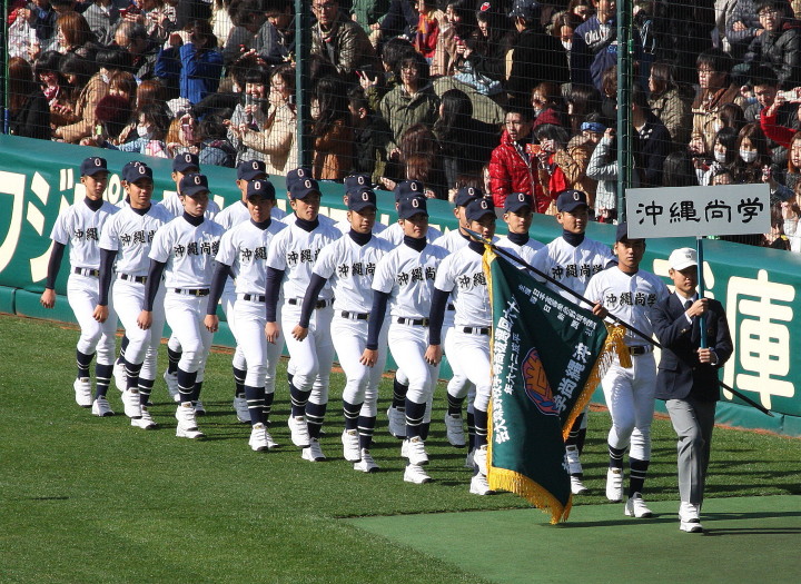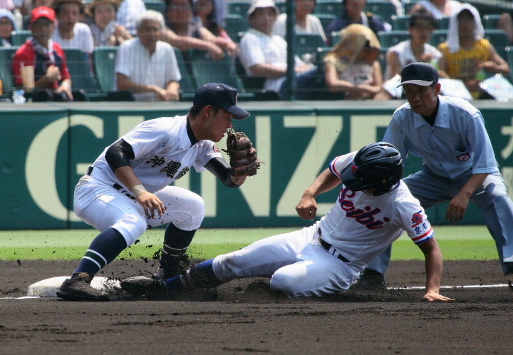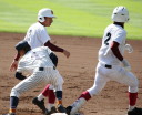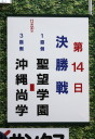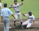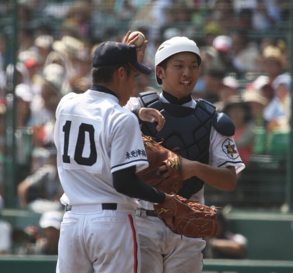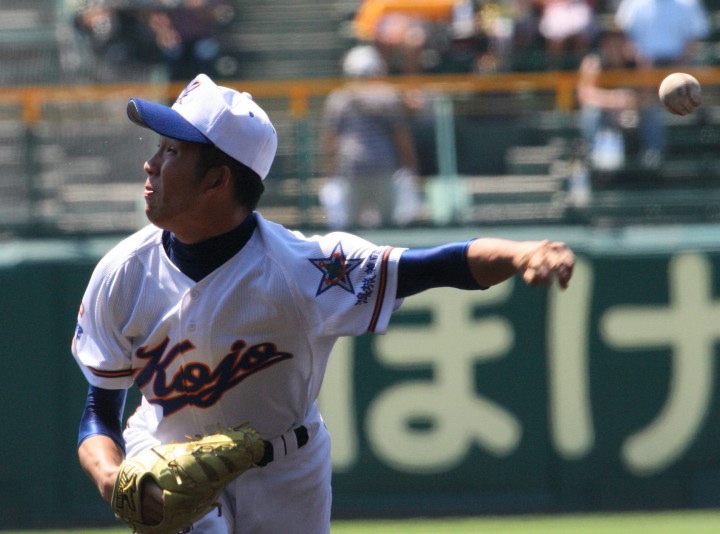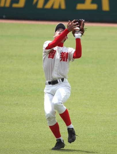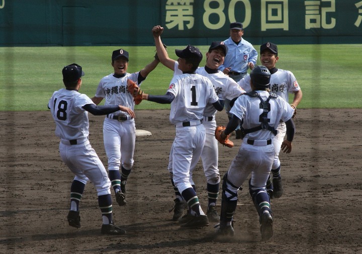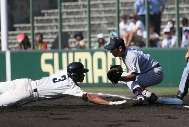 | 好カードの第2試合は予想通りの展開になった。 6回沖縄尚学は押し出し四球と相手エラーで同点に追いつき、 7.8回に福知山成美のエース仲村渠(なかんらかり)を攻めて逆転、 9回の福知山成美の猛追をかわし1点差で逃げ切った。 |