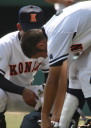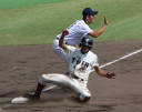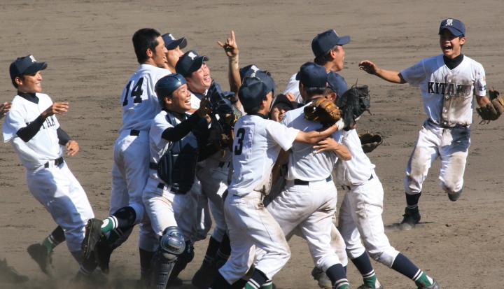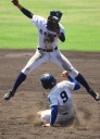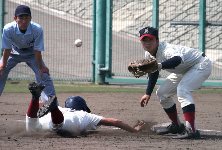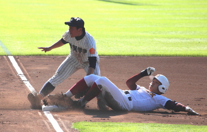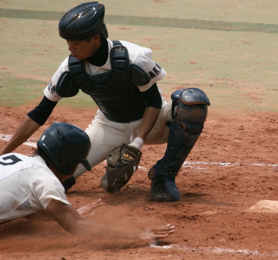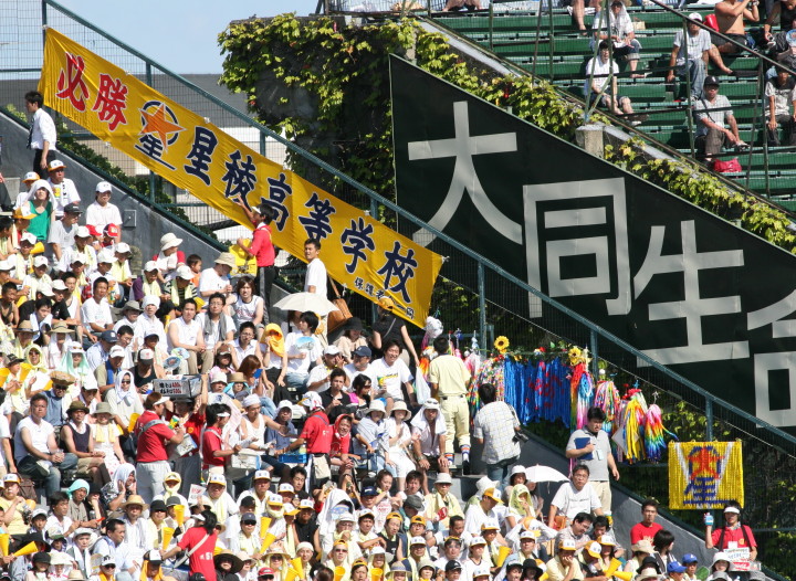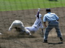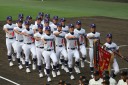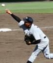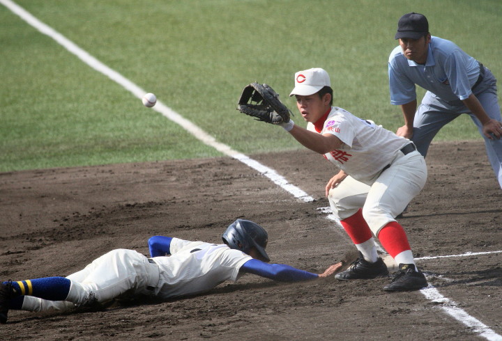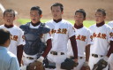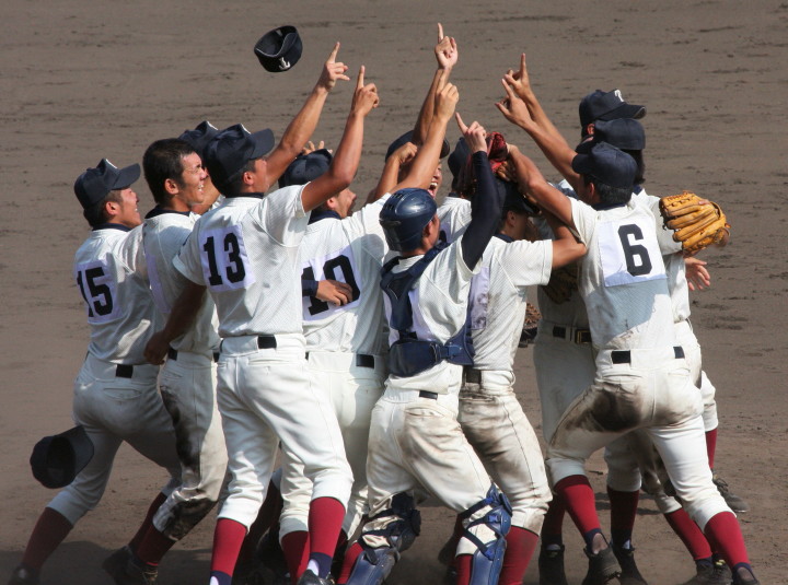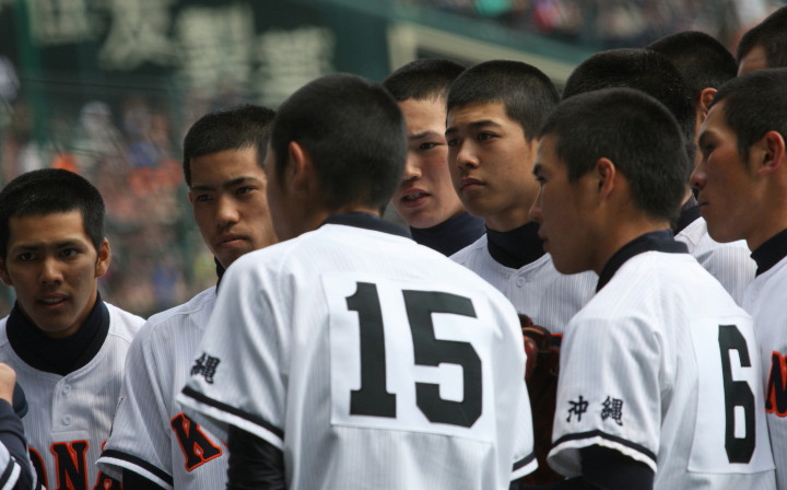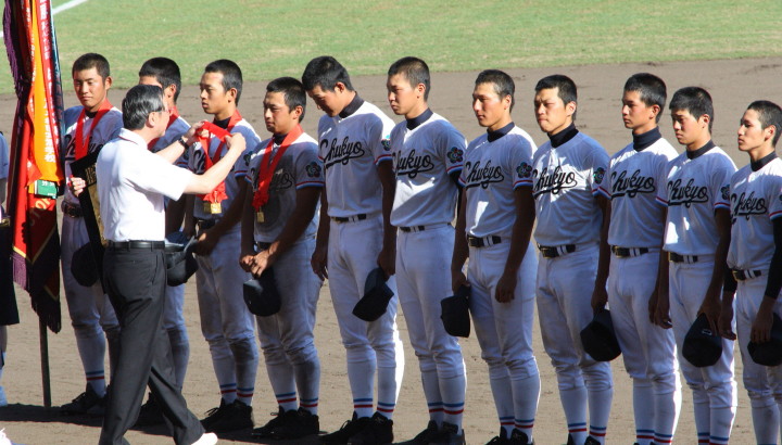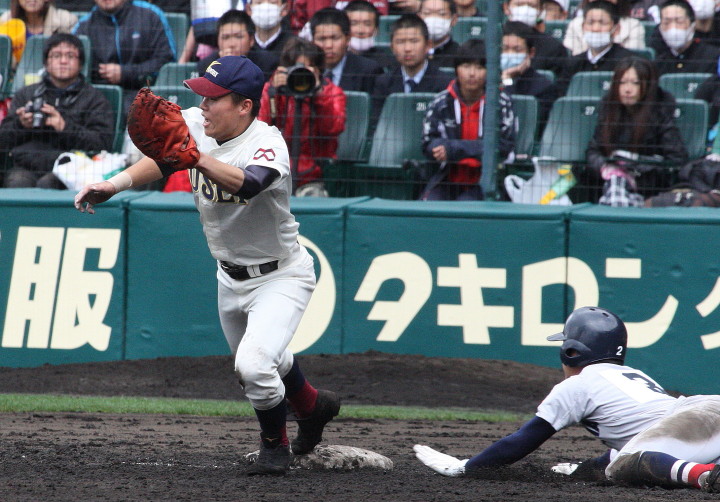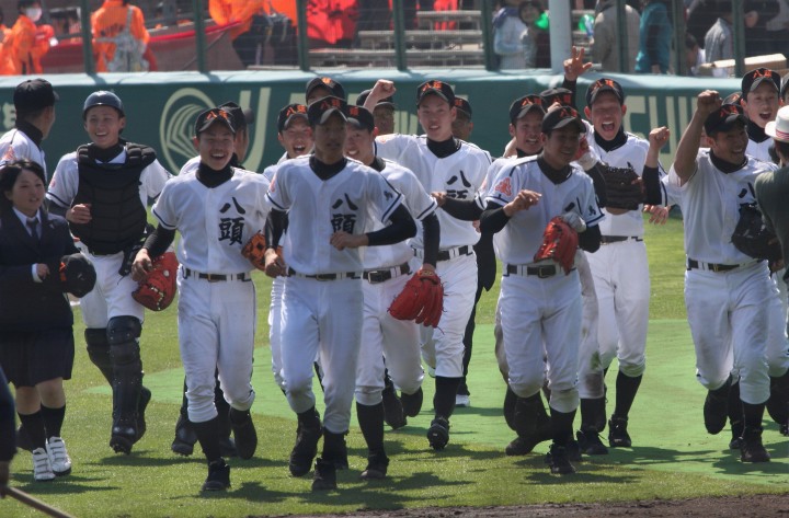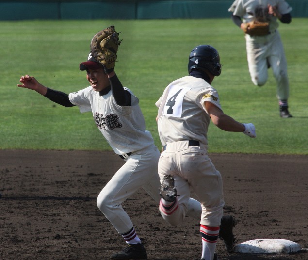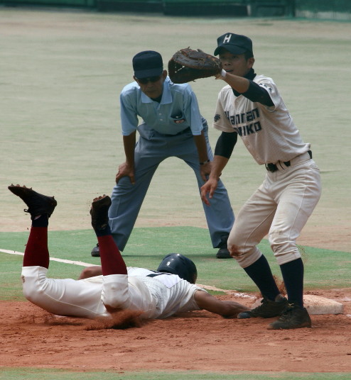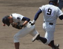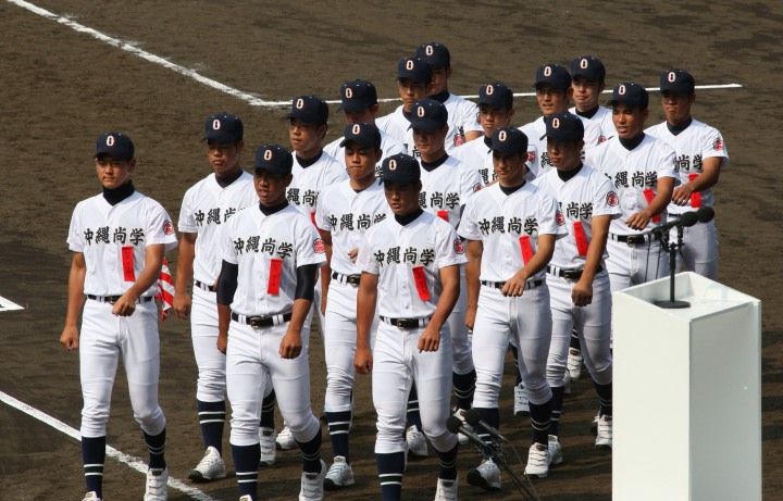 | 好カードの第2試合は予想通りの展開になった。 6回沖縄尚学は押し出し四球と相手エラーで同点に追いつき、 7.8回に福知山成美のエース仲村渠(なかんらかり)を攻めて逆転、 9回の福知山成美の猛追をかわし1点差で逃げ切った。 |