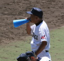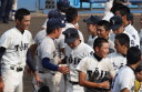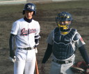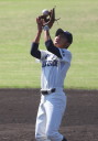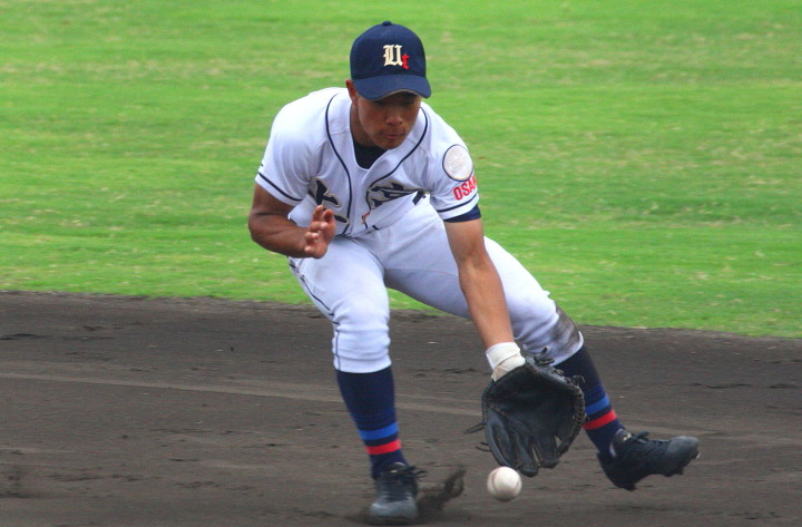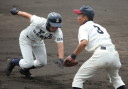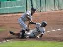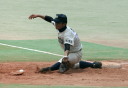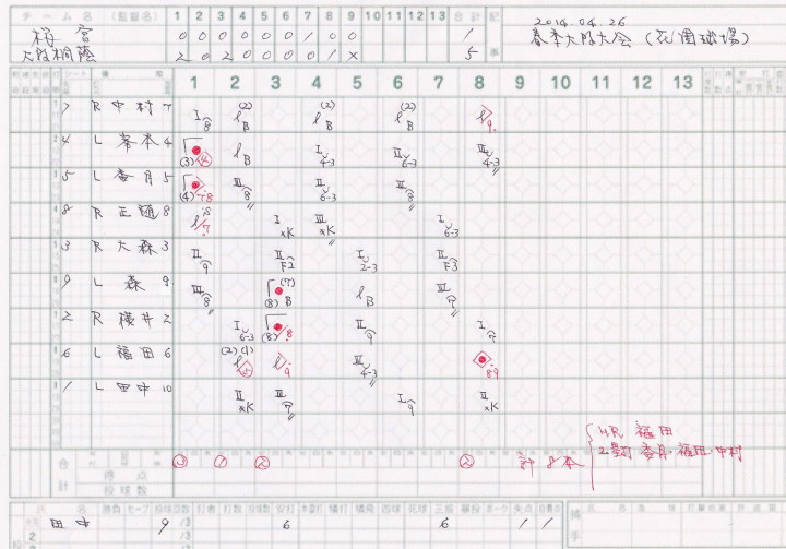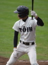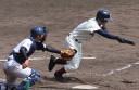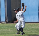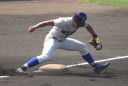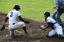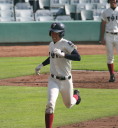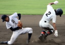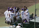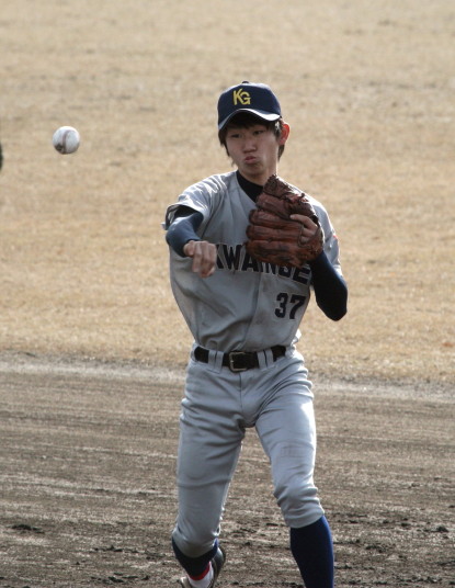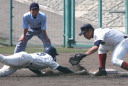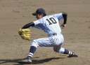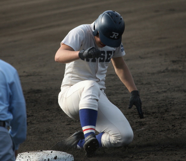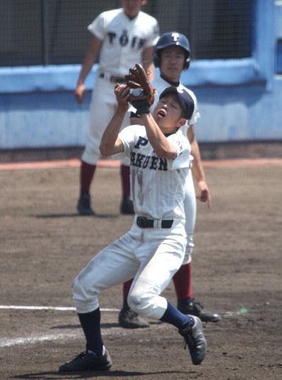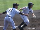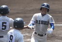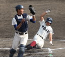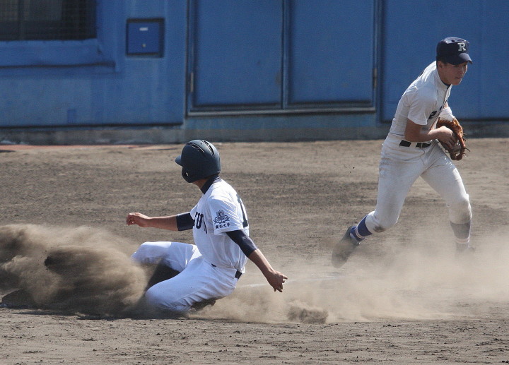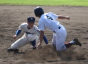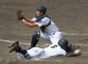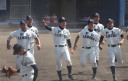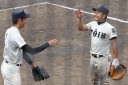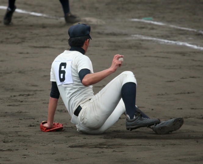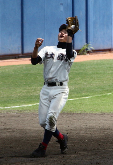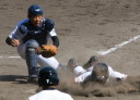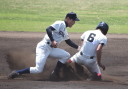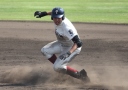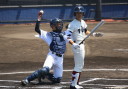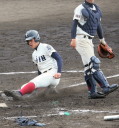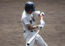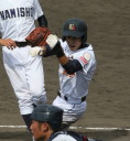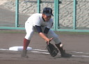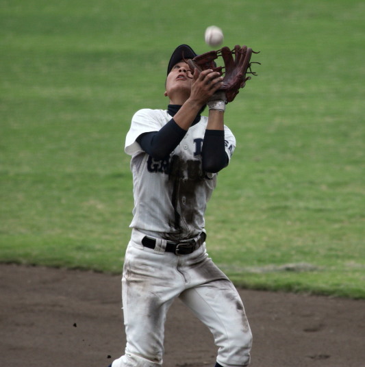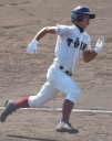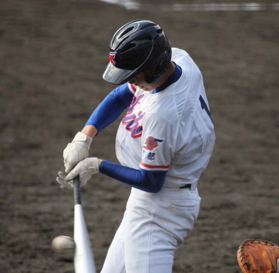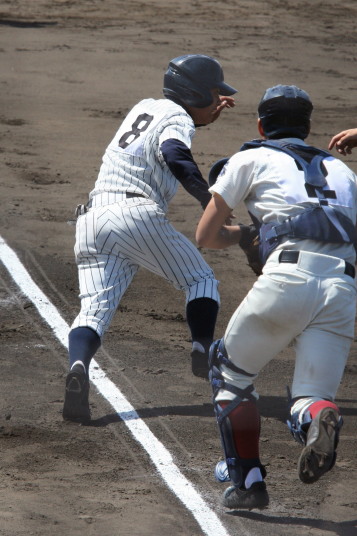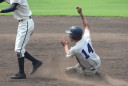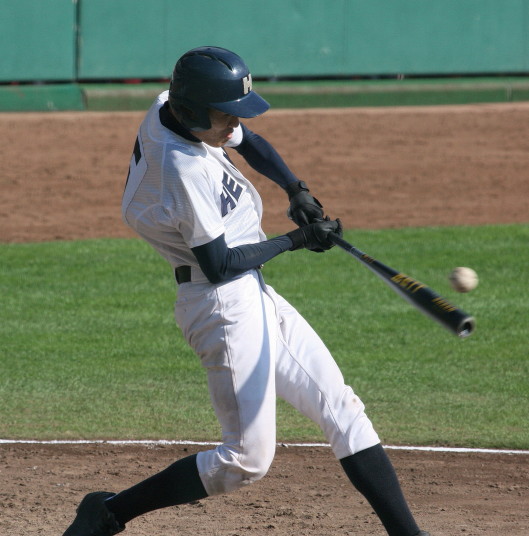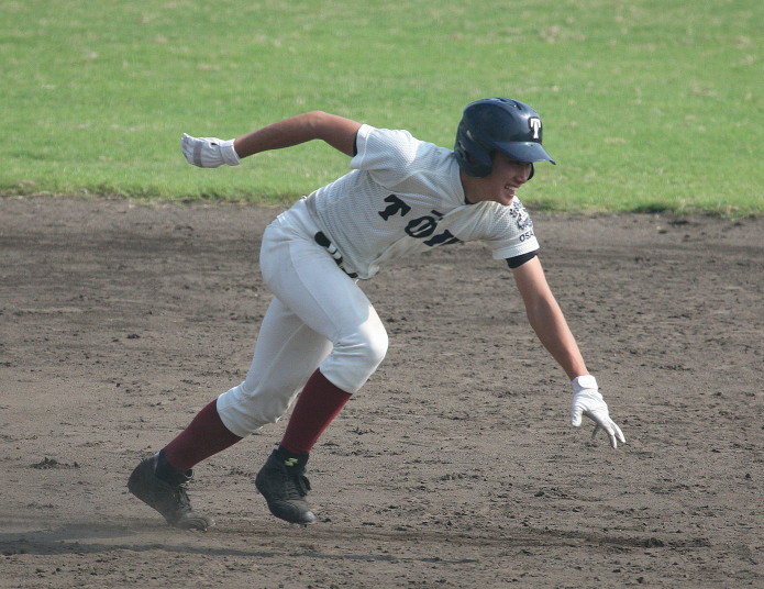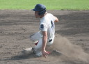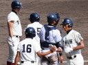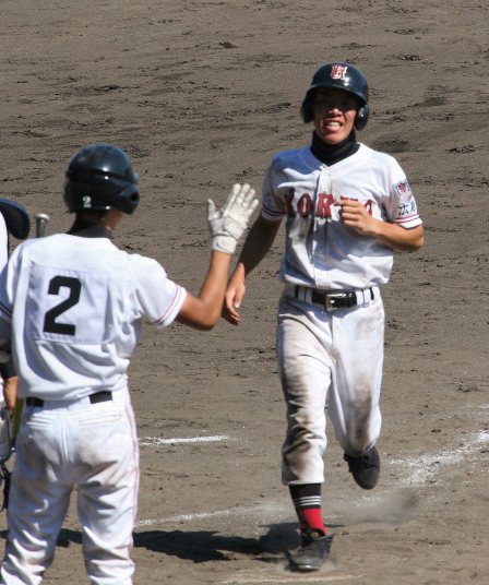 | 初回先頭打者に第一球目をホームランされた先発田中くんはこの日は制球が定まらず5回まで5安打5四球と苦戦。 2点りーどされた5回7番SS福田くんが右中間スタンドへ貴重なHR。7回裏2アウトからセンター前ヒットの福田くんが、 8番1B吉沢くんの右中間を破る2ベースで勇躍生還し同点。続く9番P田中くんが敵失を誘い吉沢くん生還し遂に勝ち越し。 |