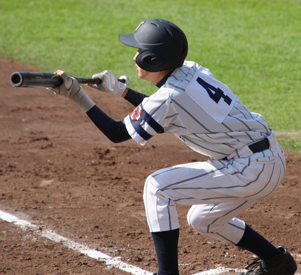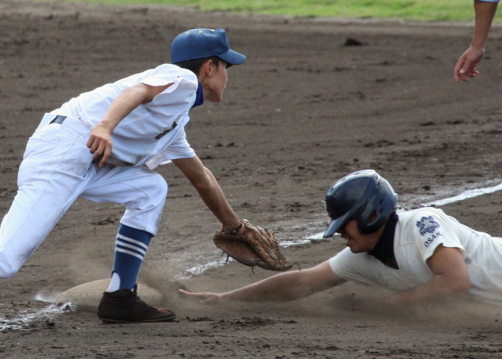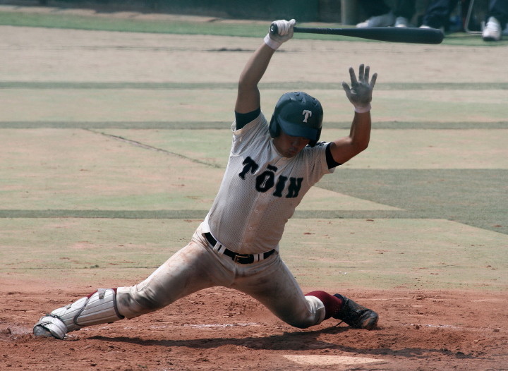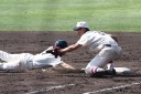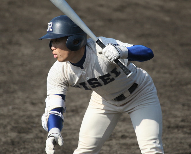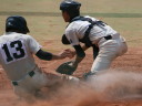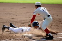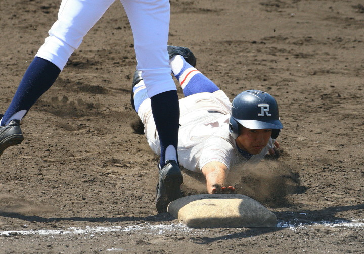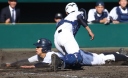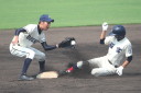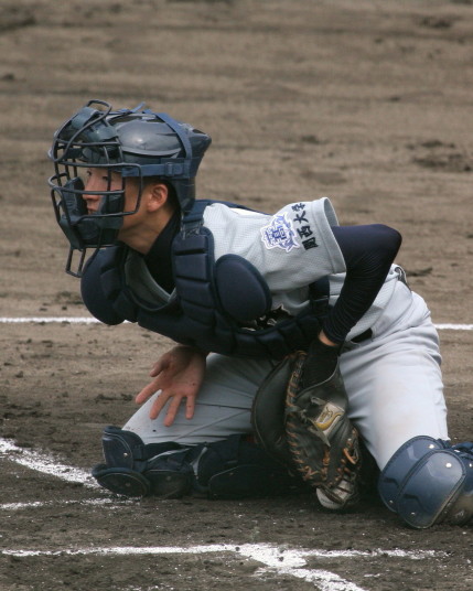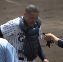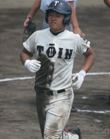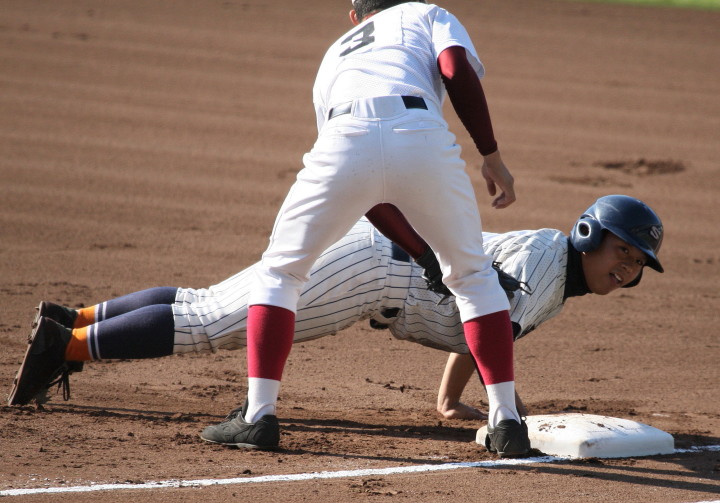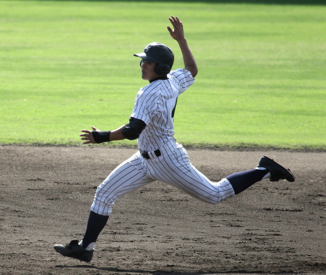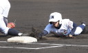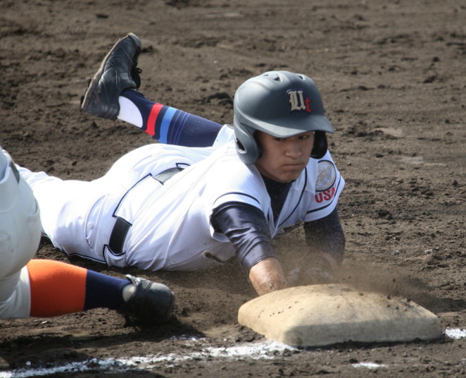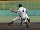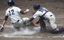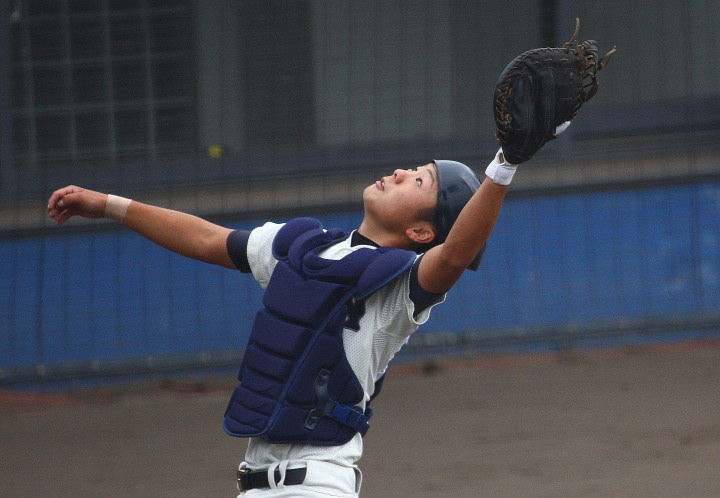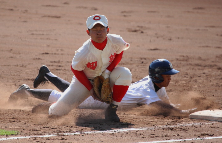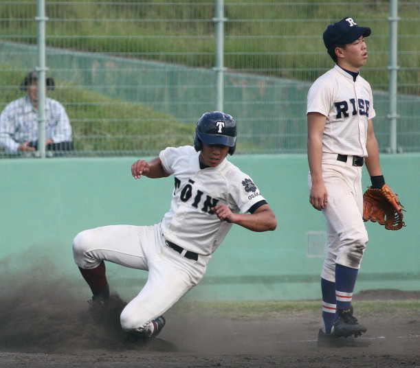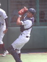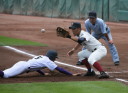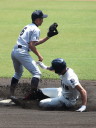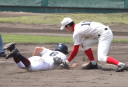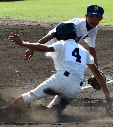 | 初回先頭打者に第一球目をホームランされた先発田中くんはこの日は制球が定まらず5回まで5安打5四球と苦戦。 2点りーどされた5回7番SS福田くんが右中間スタンドへ貴重なHR。7回裏2アウトからセンター前ヒットの福田くんが、 8番1B吉沢くんの右中間を破る2ベースで勇躍生還し同点。続く9番P田中くんが敵失を誘い吉沢くん生還し遂に勝ち越し。 |