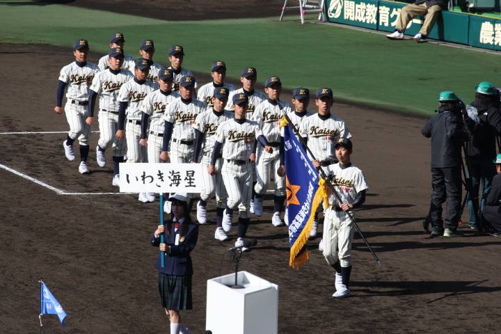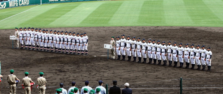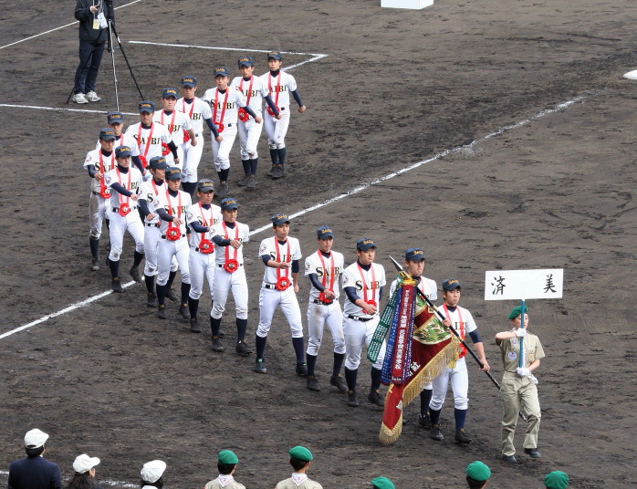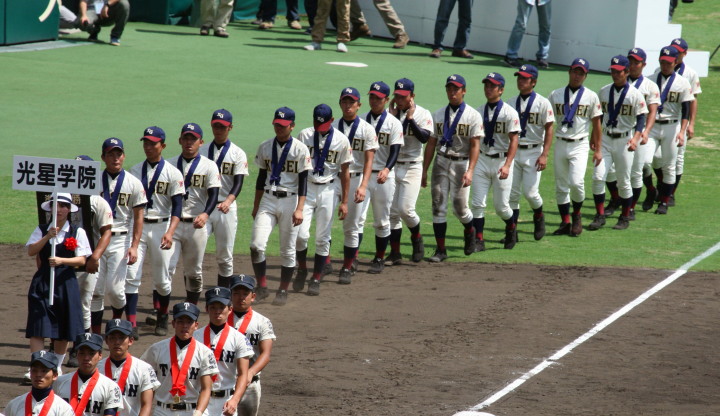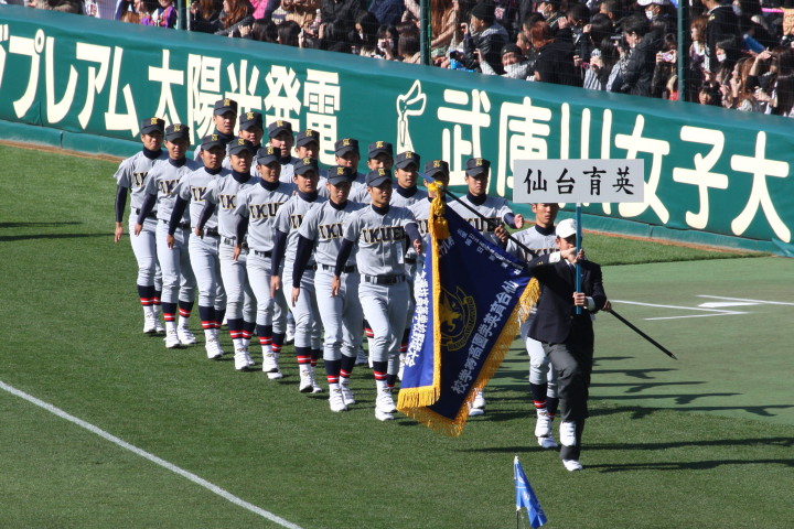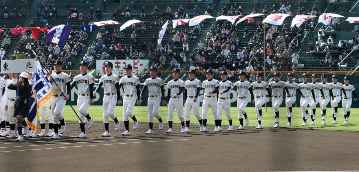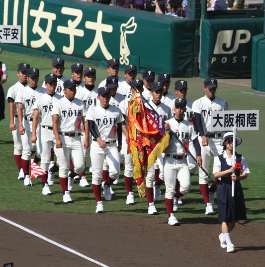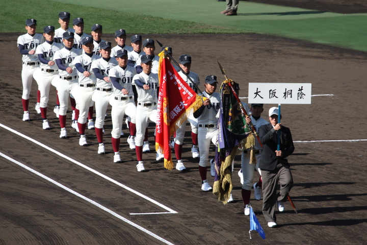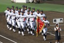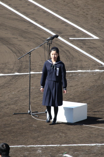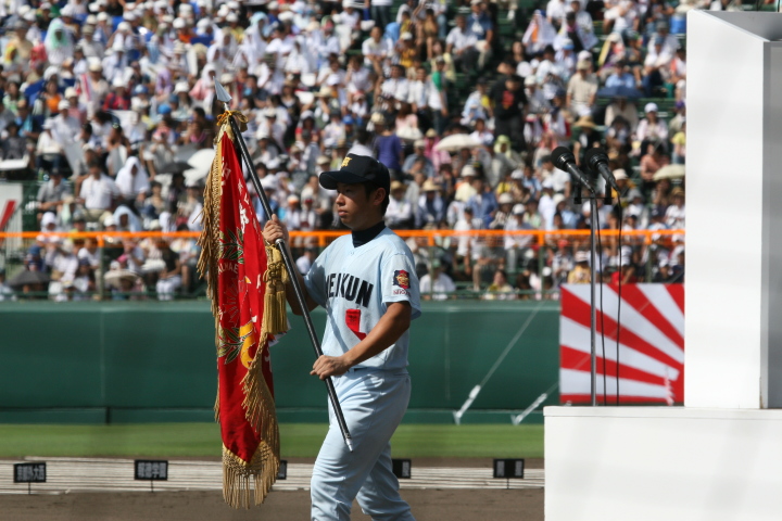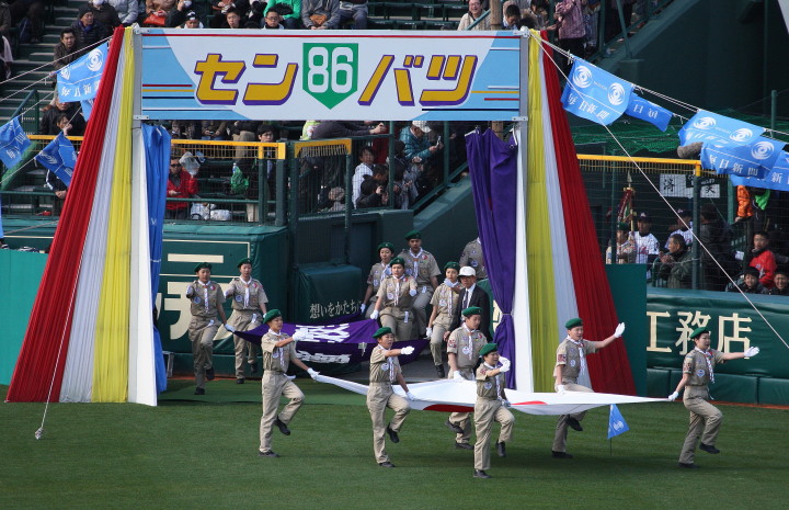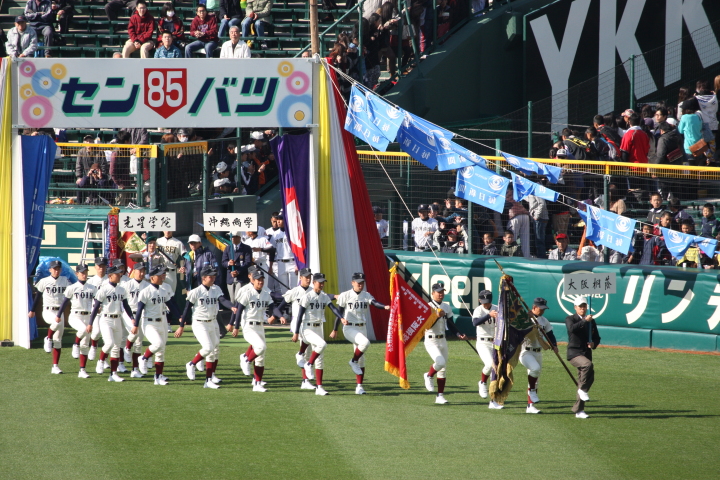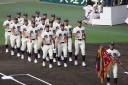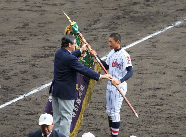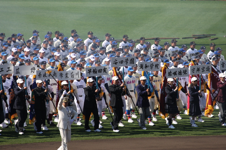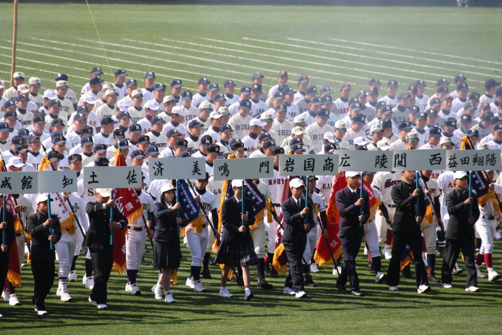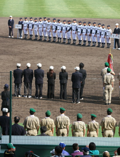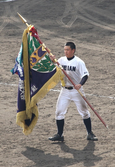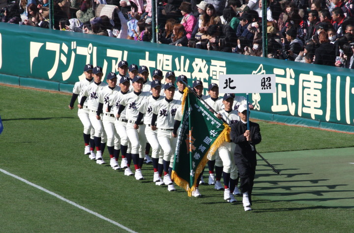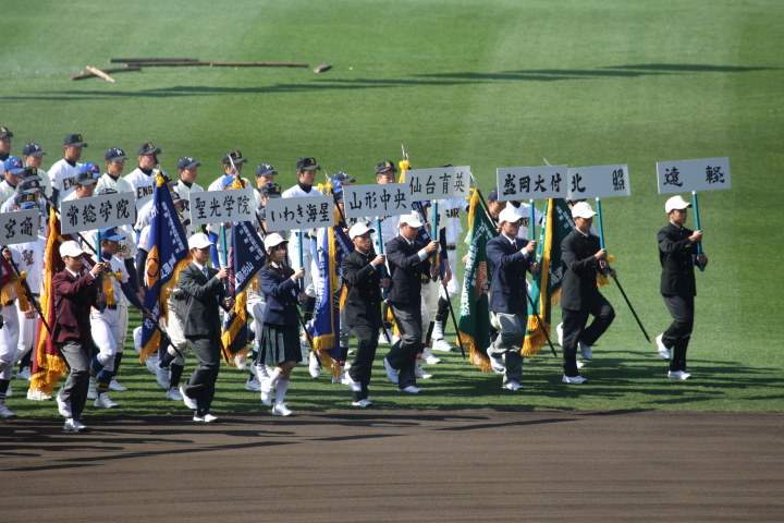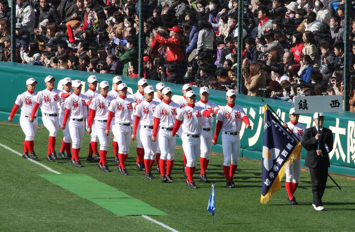 | 開幕日に相応しい好天気の中、32校高校球児の入場行進に続いて、 石巻工キャプテン阿部の素晴らしい選手宣誓に満員のスタンドから大きな拍手が沸き上がる。 三試合目はいきなりの好カードは、大阪桐蔭の完勝に終わった。 |