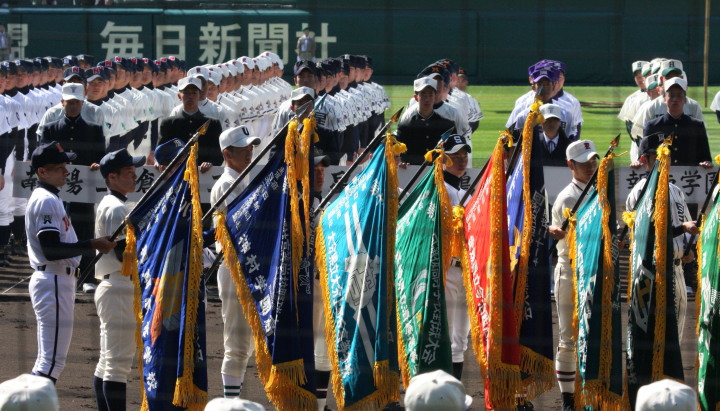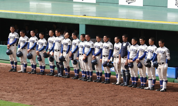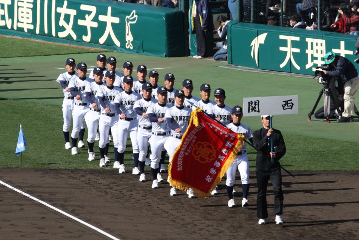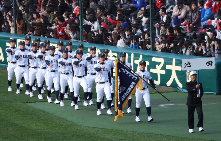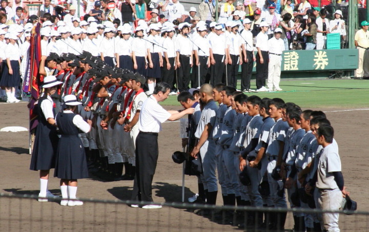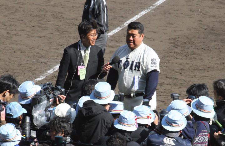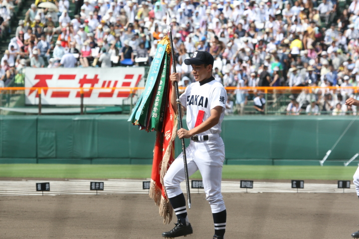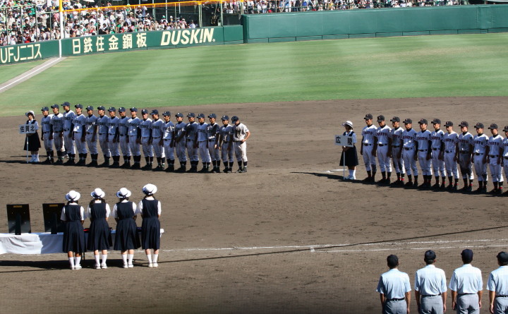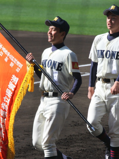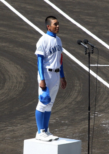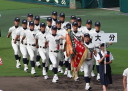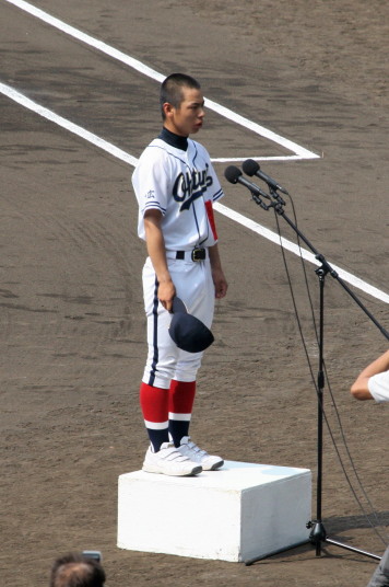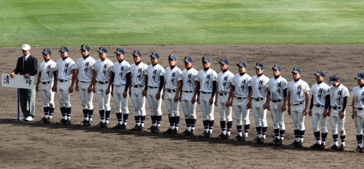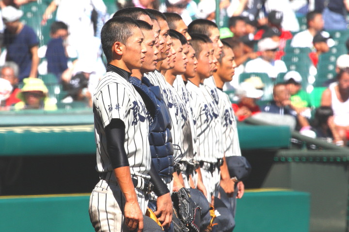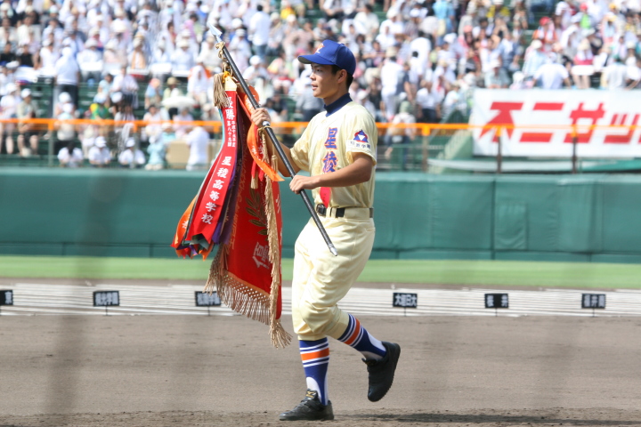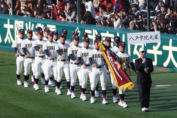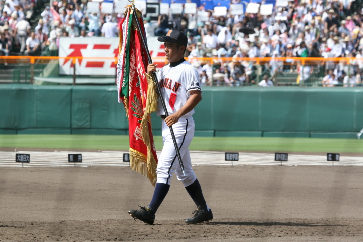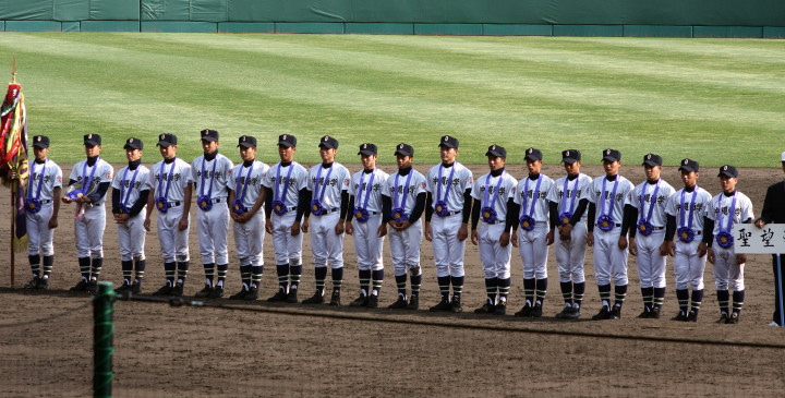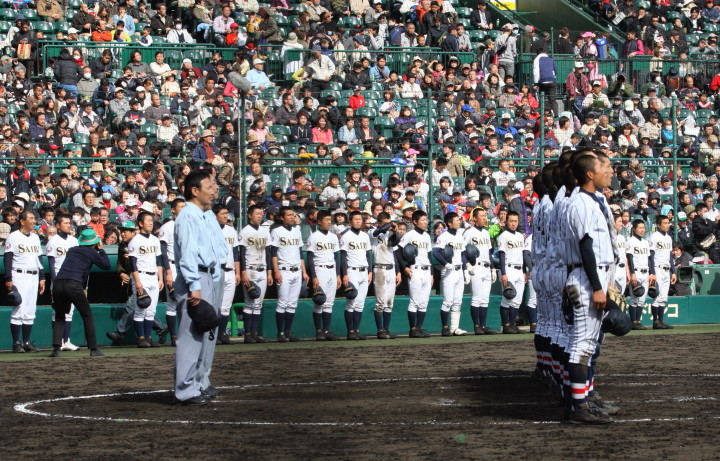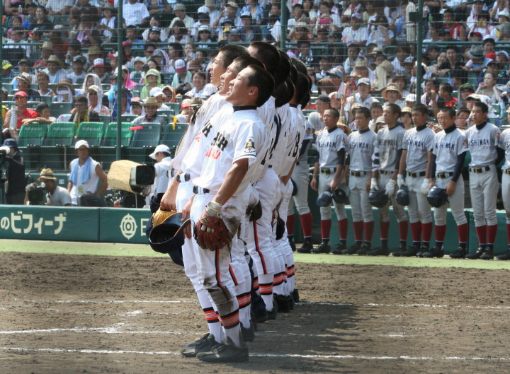 | 開幕日に相応しい好天気の中、32校高校球児の入場行進に続いて、 石巻工キャプテン阿部の素晴らしい選手宣誓に満員のスタンドから大きな拍手が沸き上がる。 三試合目はいきなりの好カードは、大阪桐蔭の完勝に終わった。 |