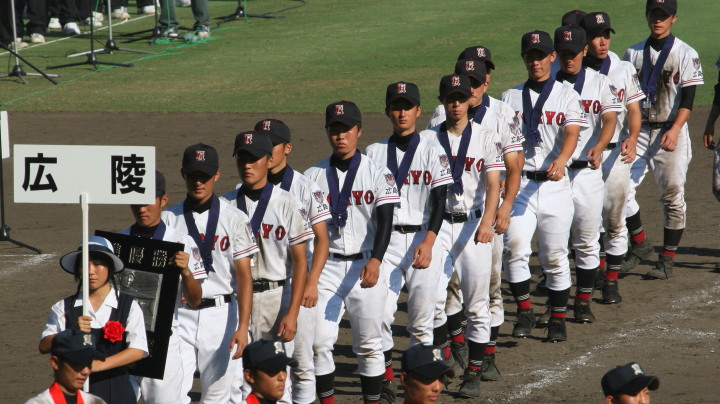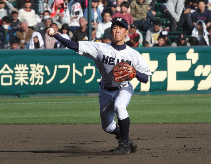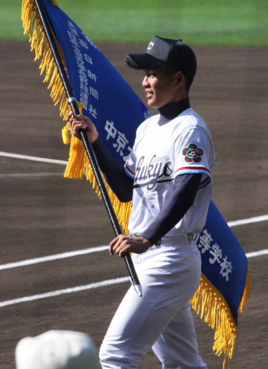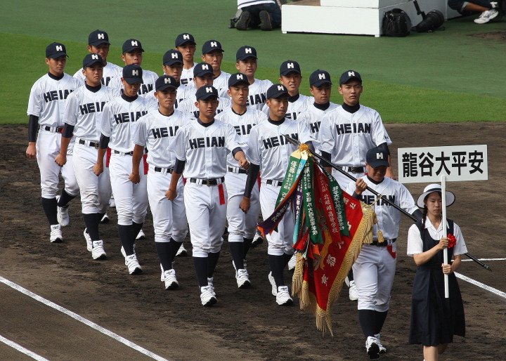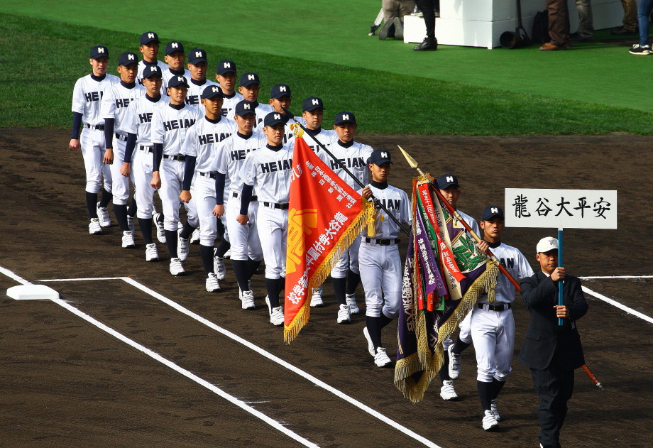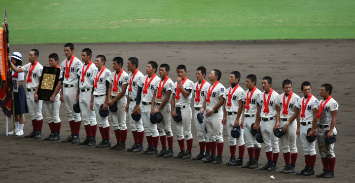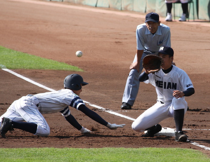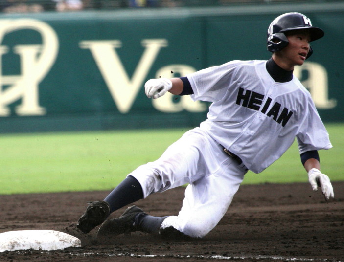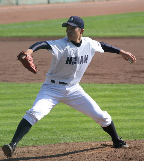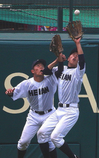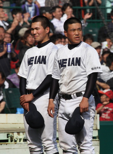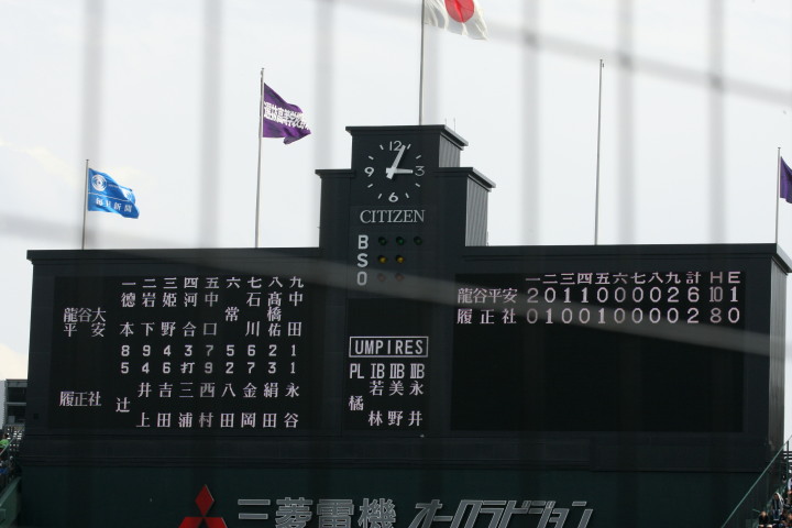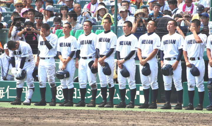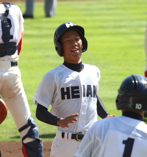 | 12時半にプレーボール。 1回表平安の1番CF徳元くんがいきなりライト線に三塁打、つづく2番RF大谷くんがすかさず 2塁内野安打でそうそうに先取点が取ったあと、ファーボールとデッドボールで押し出しの2点目。 履正社は2回6番C八田くんと8番1B 絹田くんのヒットで1点を返す。 しかし平安は3回4回と小刻みな追加点、 そして勝負を決めたのが9回平安4番1B河合くんのライトへの2ランHRだった。 |