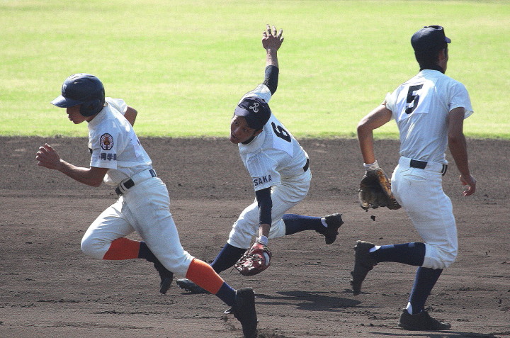 | 来春の選抜大会出場を目差す両校の対戦は5回コールドゲームで履正社が今夏決勝戦の雪辱を果たした。 2回裏1B大森のレフトオーバーのHRで大阪桐蔭が先行したが、その直後3回表当たり損ないのゴロを P松井が捕球ミス、その後2アウト満塁のピンチからタイムリーヒットなどで6失点、 4回にも2アウトからSSのタイムリーエラーも重なり更に6失点。 打線は履正社のエース溝田に3安打1失点に抑えられ完敗。 (履正社) P 溝田 C 八田 (大阪桐蔭) P 松井-福島-田中-大浦 C 横井 |