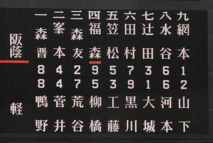 | 第二試合・大阪桐蔭の先発葛川が8回を6安打6奪三振1失点と大阪大会からの好調を維持。 森友哉が一本目レフトポール際・二本目ライトスタンドへのHRを含む3安打4打点、 四番近田もレフト越えHR、トータル14安打を放って圧勝し二回戦へ進んだ。 |