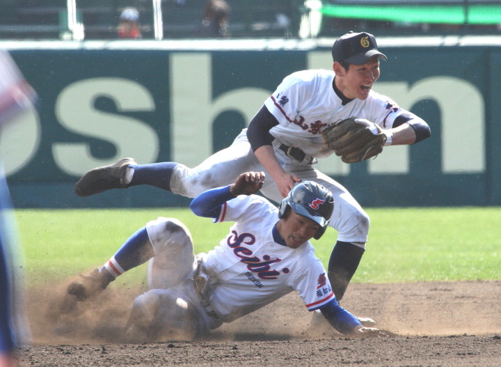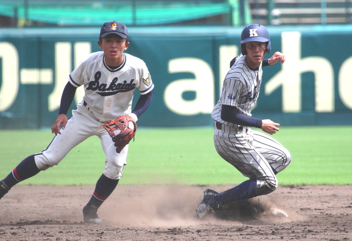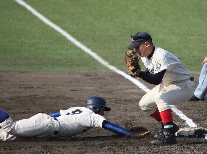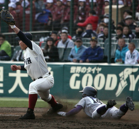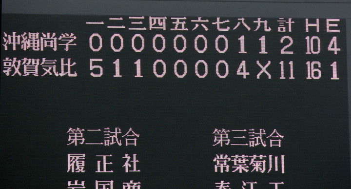 | 第三試合・敦賀気比 6-5 京都翔英 京都翔英が1回1.3塁でダブルスチールを仕掛け、タイミングはアウトの三塁ランナーが カバーした投手岸本と激突、落球の間に二者生還する。2回敦賀気比・米満一の3ランなどて逆転。 5回京都翔英・小谷の3ランで再逆転、しかし5回と7回に敦賀気比がヒットを繋いで加点し競り勝った。 |