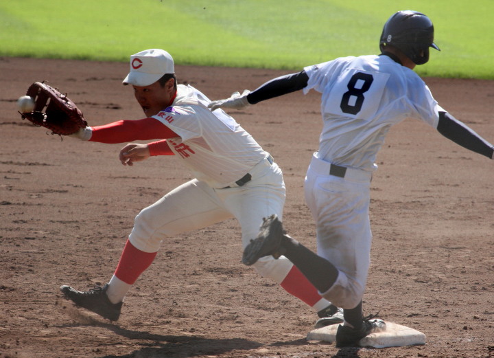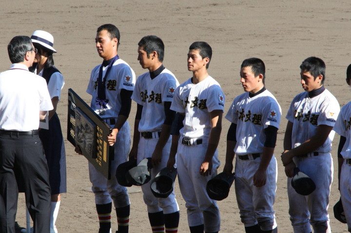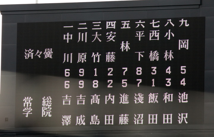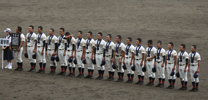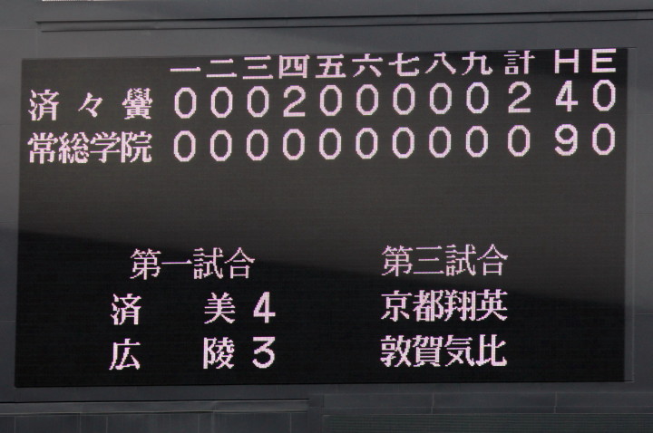 | 第二試合・濟々黌 2-0 常総学院 大竹と飯田両投手の好投で緊迫した好ゲームになった。 均衡を破ったのは4回濟々黌がエース大竹のタイムリースリーベースで2点先取。 常総学院は再三のチャンスに得点出来ず、9安打を放ちながら4安打の濟々黌に完封された。 |