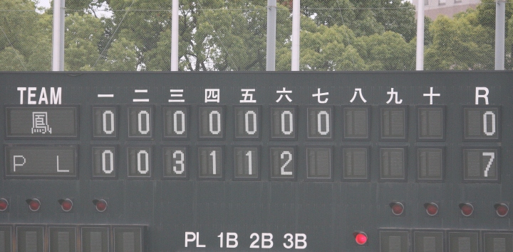 | 第二試合・注目のPL学園が3回に笹岡、中川、藤原の三連打で大きくリードし、8回には藤原の4本目となる スリーベースで8回終了のコールドゲームで快勝し、明日履正社との決勝戦へ進んだ。 先発鈴木は偕星打線を散発5安打無失点に抑える。 監督不在、校長が責任教諭兼部長でチームをまとめ久し振りの近畿大会への出場決定。 |