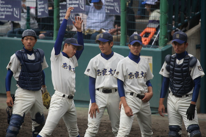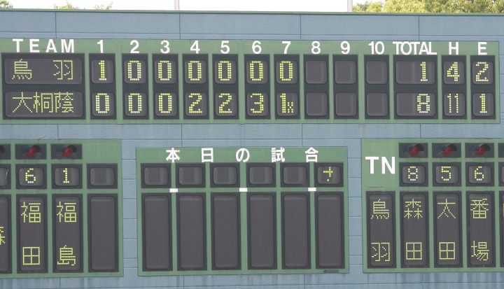 | (第1試合) 両校ともエースを温存した序盤に失点、その後は八木、坂本とも好投したが 7.8回に両校とも思わぬ大量得点、僅差で翔英が逃げ切った。 (第2試合) 優勝候補NO.1の大阪桐蔭が7回コールド完封負け!!立ち上がり1回に4番 近田が左頬にデットボールを受け退場、乾の執拗な内角攻めに1安打。 昨年の近畿大会準決勝戦でも天理に8-4で破れている。 |