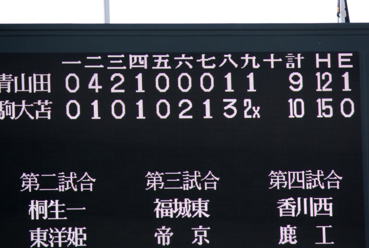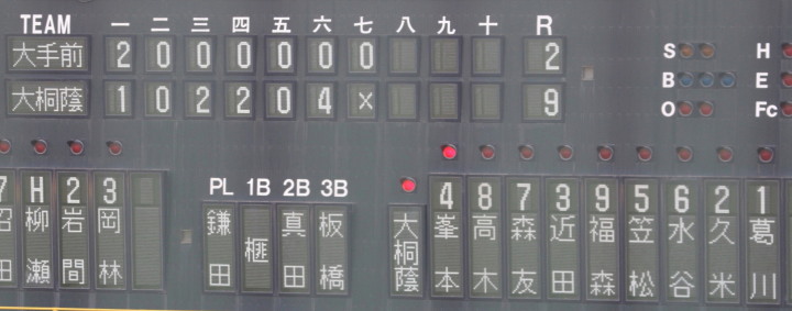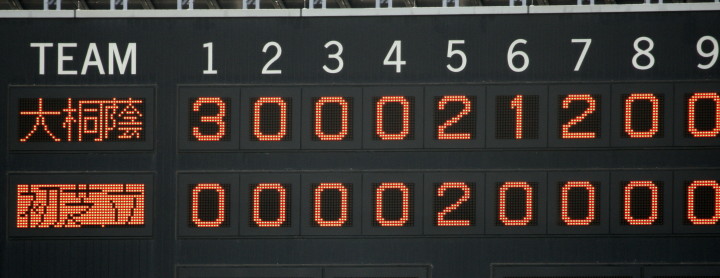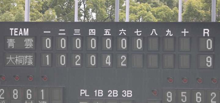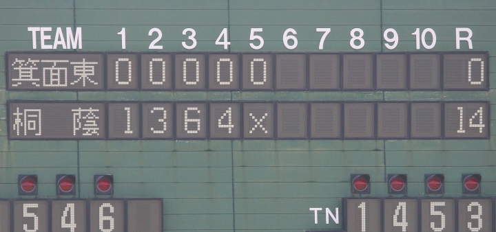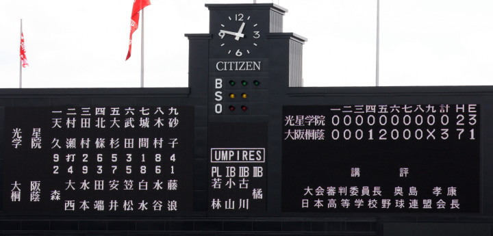 | 大阪桐蔭の7回コールド勝ち。 4回CF4番正随のショート内野安打、犠打犠飛で三塁へ、7番RF森がセンター前・8番SS福田がライト前と 連続タイムリーが出て逆転。その後は一方的な試合展開になり、7回裏6番1B大森のレフト越えHRで7点差になった。 珍しい サヨナラホームラン !! |