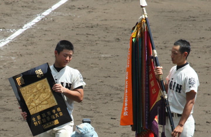 | 15日間のファイナルは今春選抜決勝戦と同カードになった。 4回大阪桐蔭の7番白水がセンター越えのHRで先制し5回敵失も有って2点加点。 連投の藤浪が光星学院の強力打線を2安打無失点に押えて、春夏連覇を達成した。 これは7校目の快挙 !! おめでとう 大阪桐蔭 !! 光星学院は3季連続の準Vこれも立派 !! |