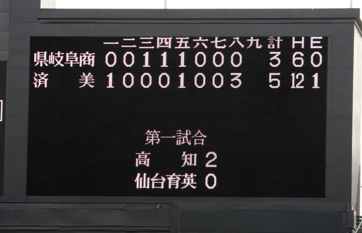 | 第二試合・済美 6-3 県岐阜商 済美・2年エース安楽が被9安打3失点で投げ切った。8回裏一挙に4得点で逆転勝ち。 県岐阜商は7回からの小刻みな継投リレーでの逃げ切りが成功せず惜敗。 |