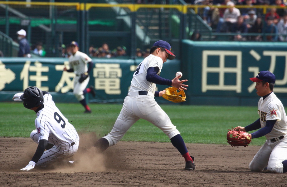 | 第一試合・履正社3回表9番P溝田がライト線三塁打、1番4B井上のサード内野安打、 2番3B辻のスクイズは失敗したが3番SS吉田のセンター前タイムリーで先制。 その後6.8回と小刻みに得点し、最終回には4番LF中山が左中間へHR。 エース溝田が三田松聖を5安打に抑え完封しベスト4へ。 |