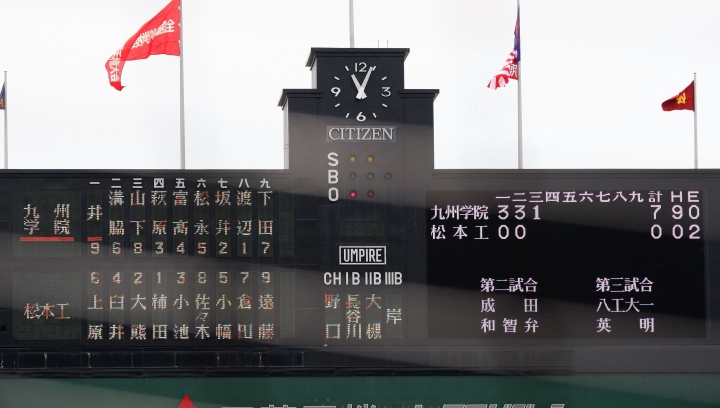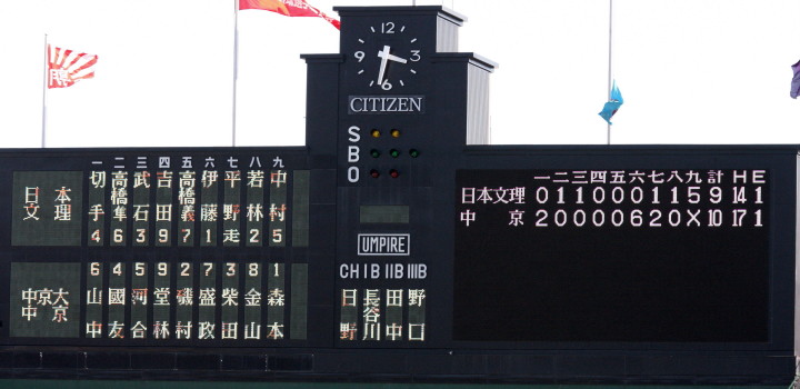 | 中央ネット裏からの撮影位置が今回は変わり右左関係なくバッターのショットはアウト。 第一試合・平安が9回ツーアウト無走者から5番有田の右前タイムリー打で同点とし延長戦へ。 11回平安ワンアウト満塁、6番嶋田が右前サヨナラヒットで接線を勝ち抜いた。 第二試合・光星学院が城間の好投で遊学館を完封、打線の中軸・北條が9回2ランHR。 |