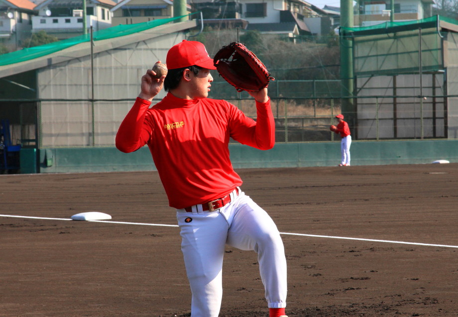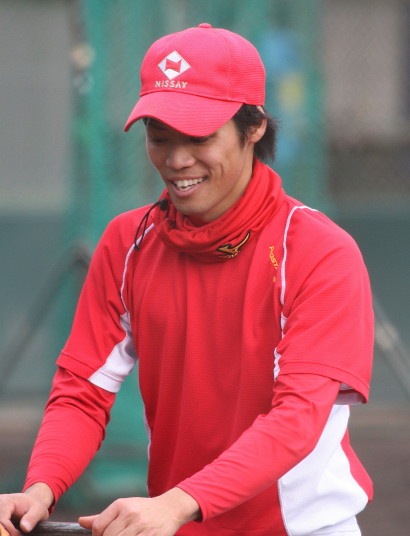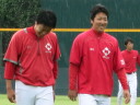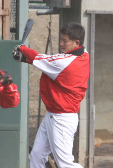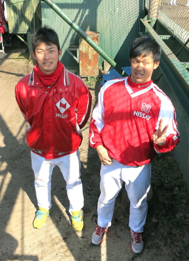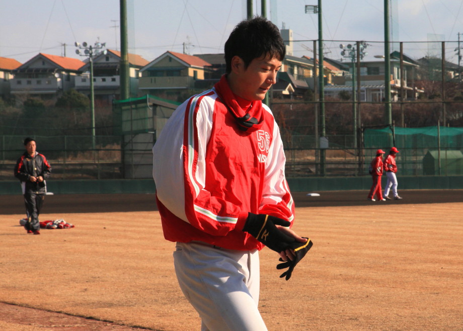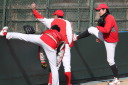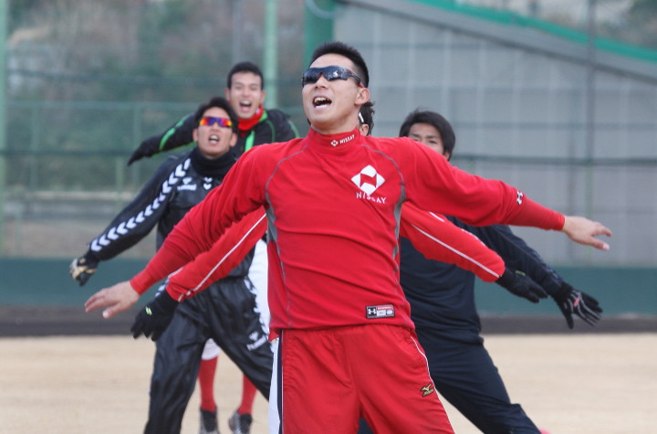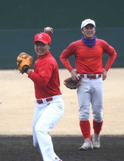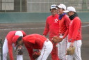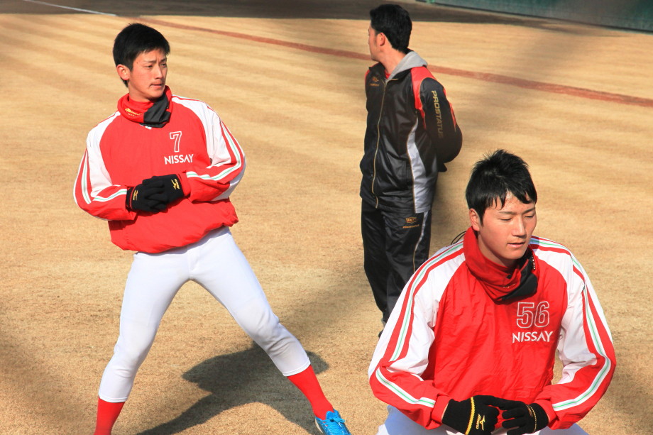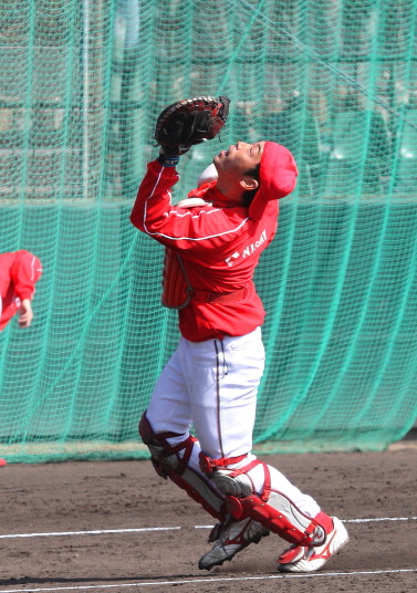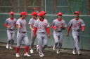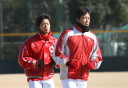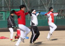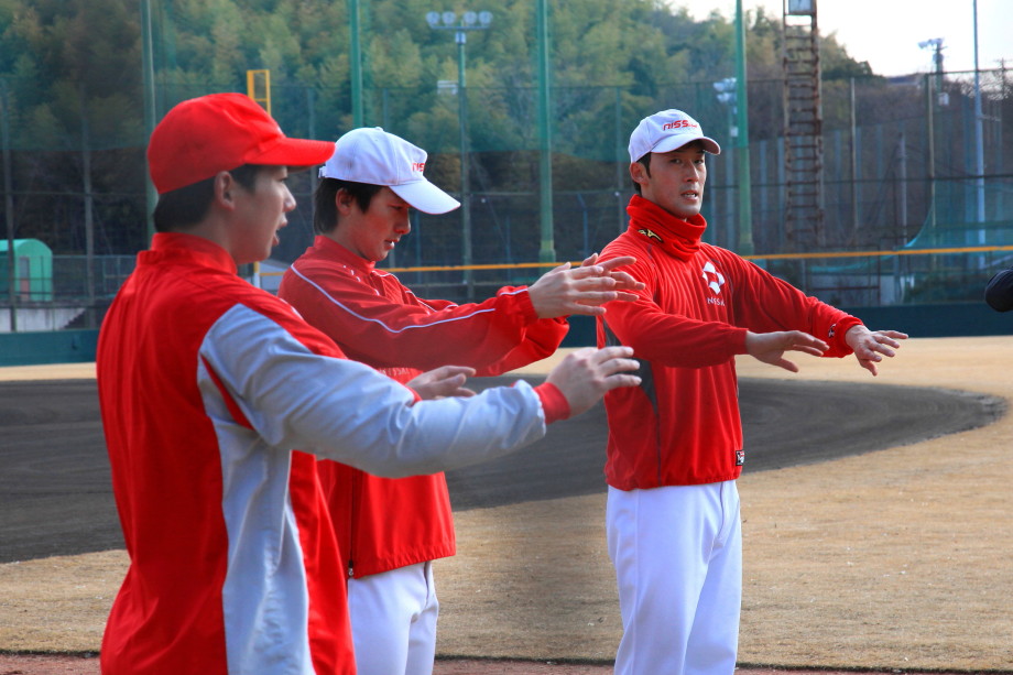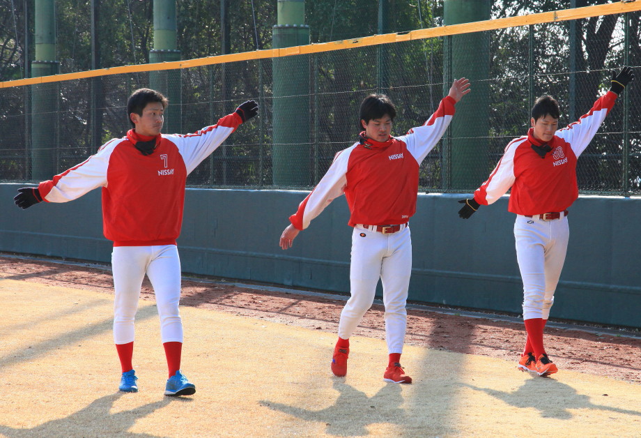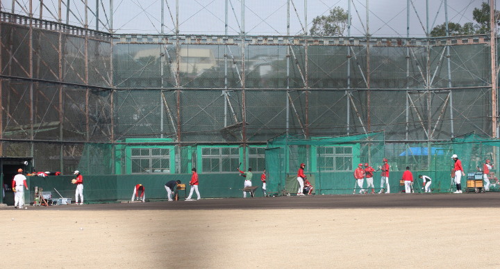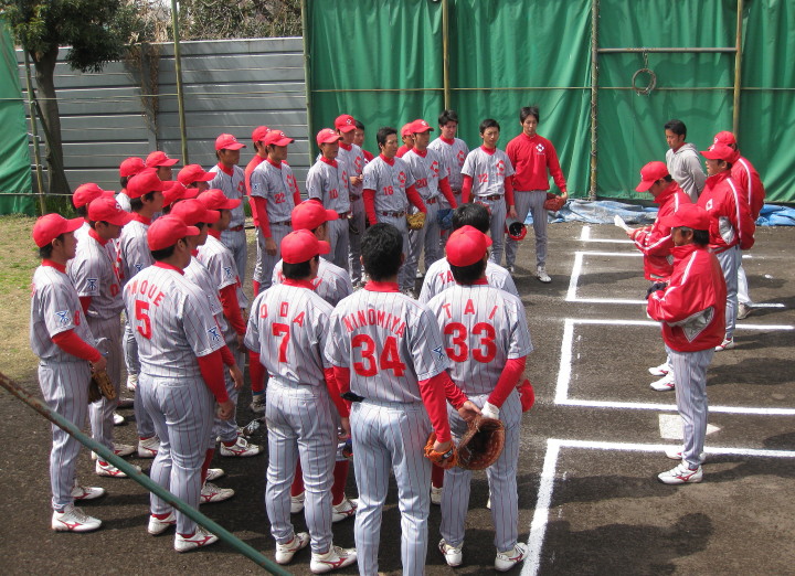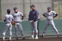 | いよいよ今シーズンの始動、既存メンバー23名と新人2名が集合し入念なアップから、 投手は立ち投げ、野手は捕球とスローイングで今日のメニューは終了した。 新人7名の内、今日の参加は、RF上西と2B原田の2名。 二人とも180cm超え、50m5秒台の俊足、遠投110mの上西・90mの原田、 特に上西のスケールの超大さは頼もしい。 |