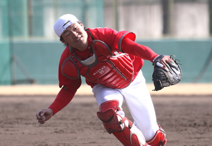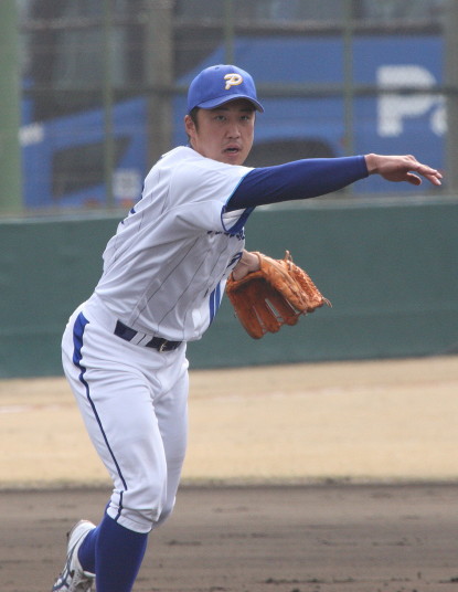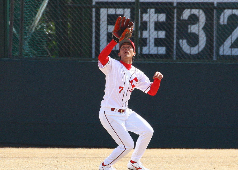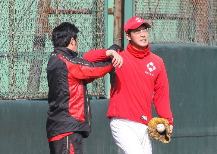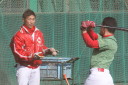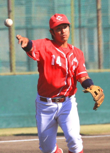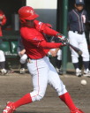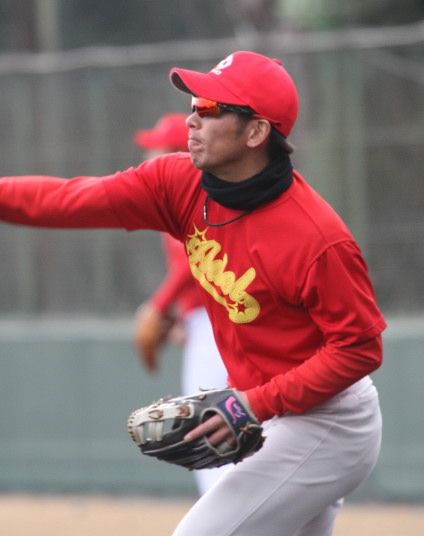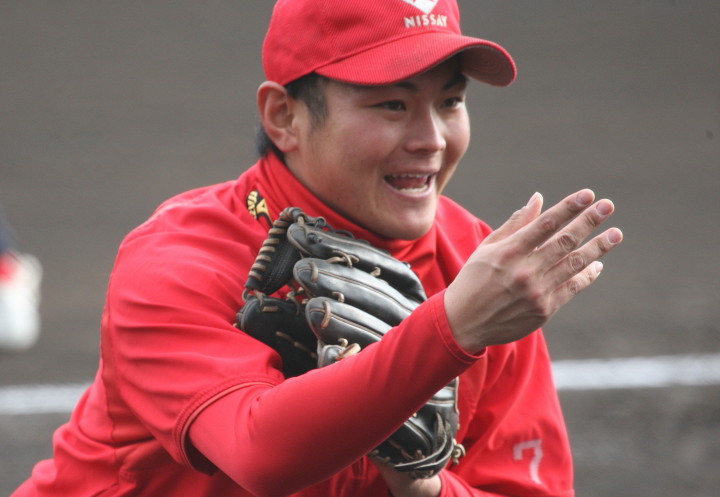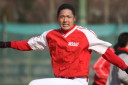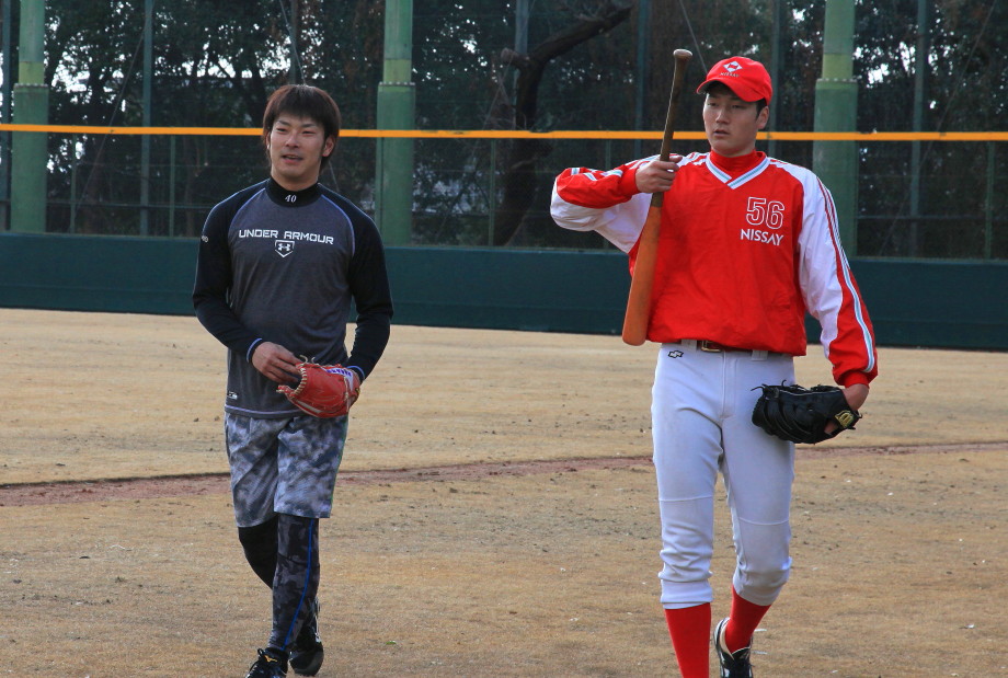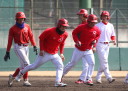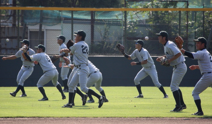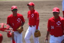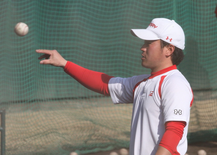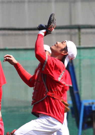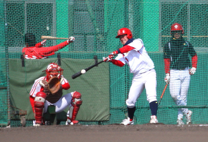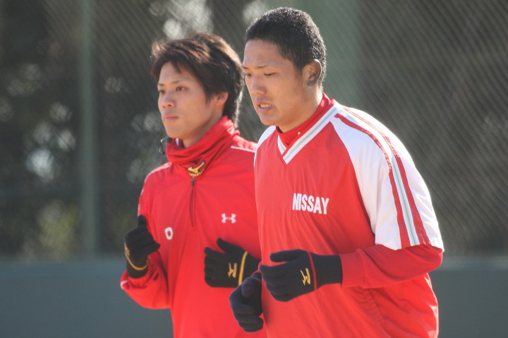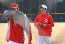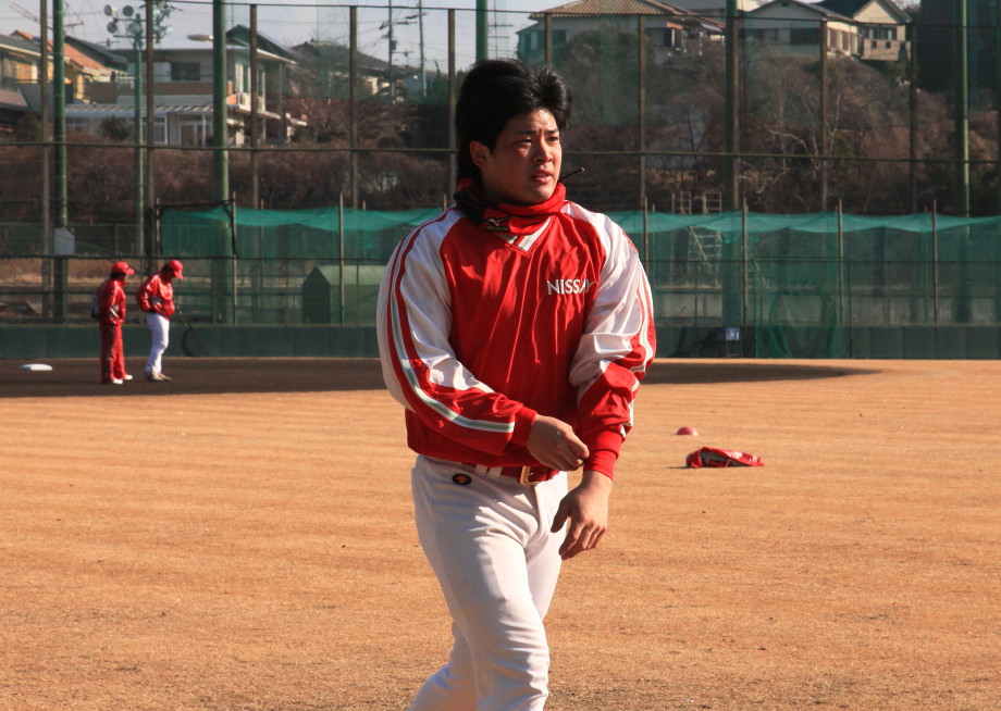 | いよいよ今シーズンの始動、既存メンバー23名と新人2名が集合し入念なアップから、 投手は立ち投げ、野手は捕球とスローイングで今日のメニューは終了した。 新人7名の内、今日の参加は、RF上西と2B原田の2名。 二人とも180cm超え、50m5秒台の俊足、遠投110mの上西・90mの原田、 特に上西のスケールの超大さは頼もしい。 |