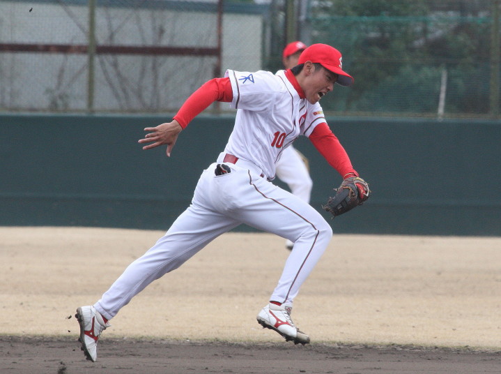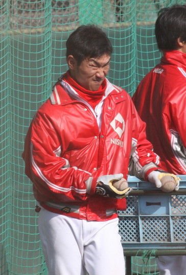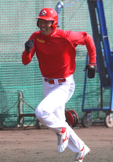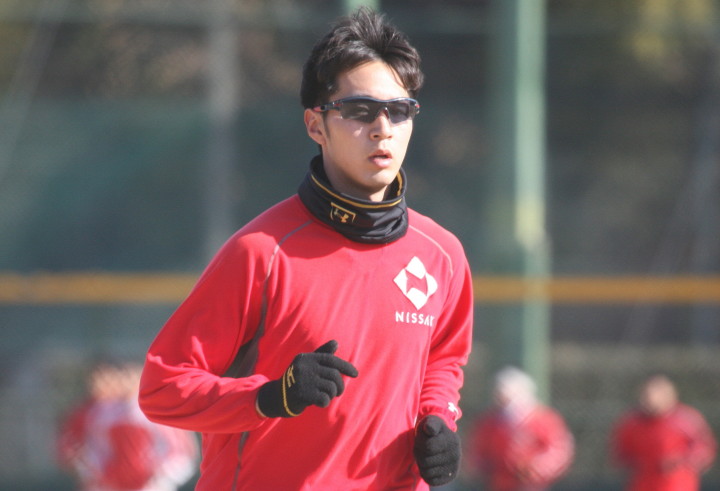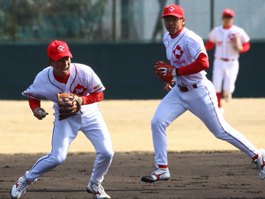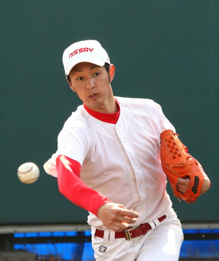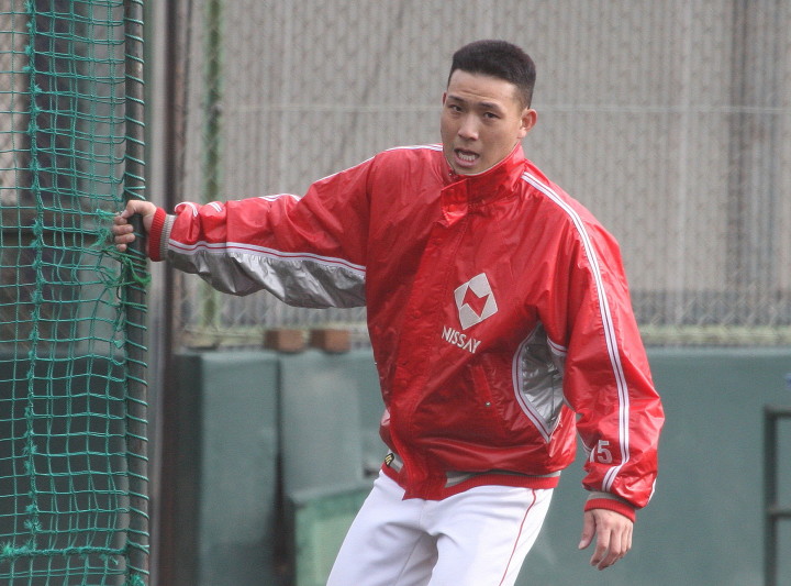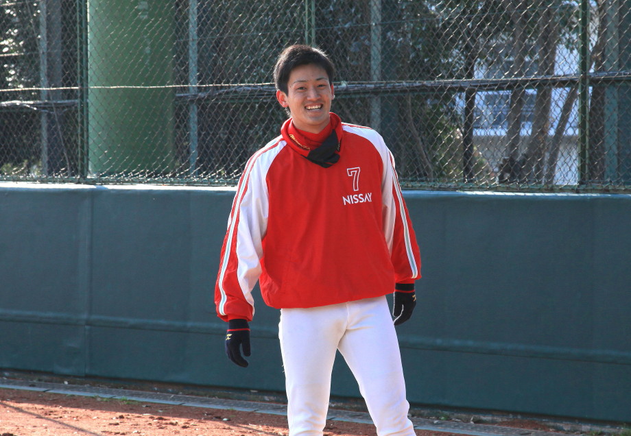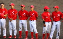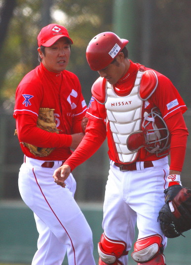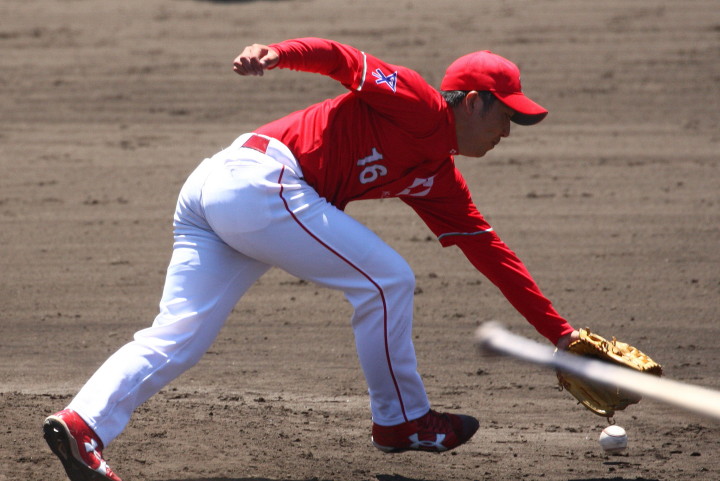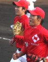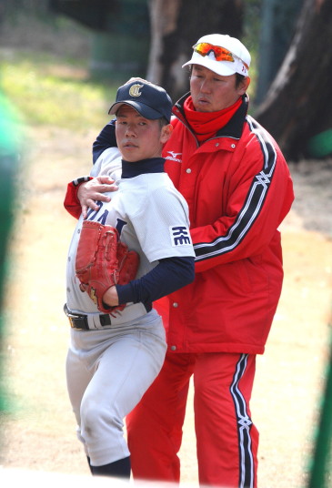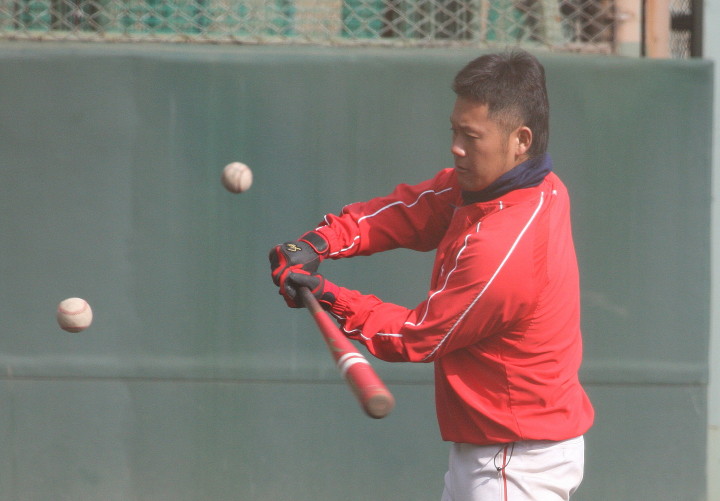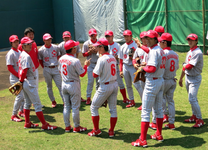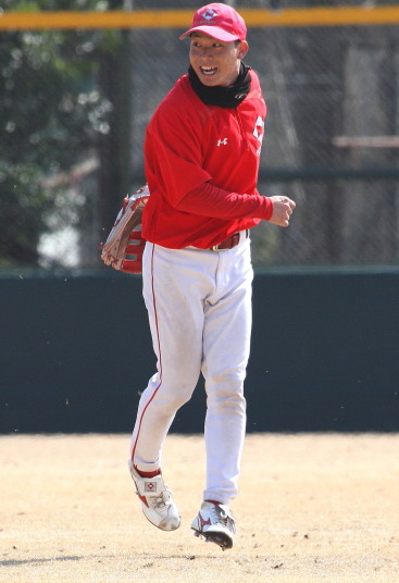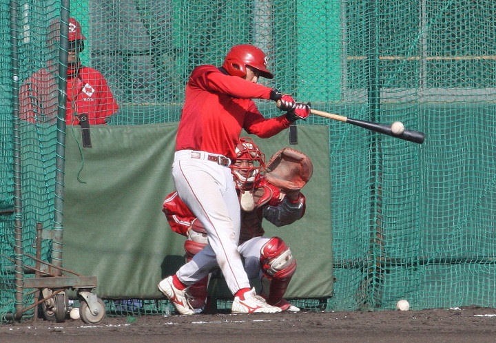 | いよいよ今シーズンの始動、既存メンバー23名と新人2名が集合し入念なアップから、 投手は立ち投げ、野手は捕球とスローイングで今日のメニューは終了した。 新人7名の内、今日の参加は、RF上西と2B原田の2名。 二人とも180cm超え、50m5秒台の俊足、遠投110mの上西・90mの原田、 特に上西のスケールの超大さは頼もしい。 |