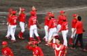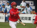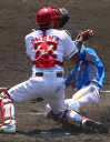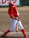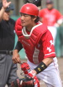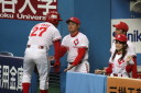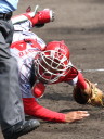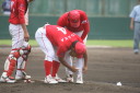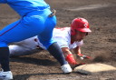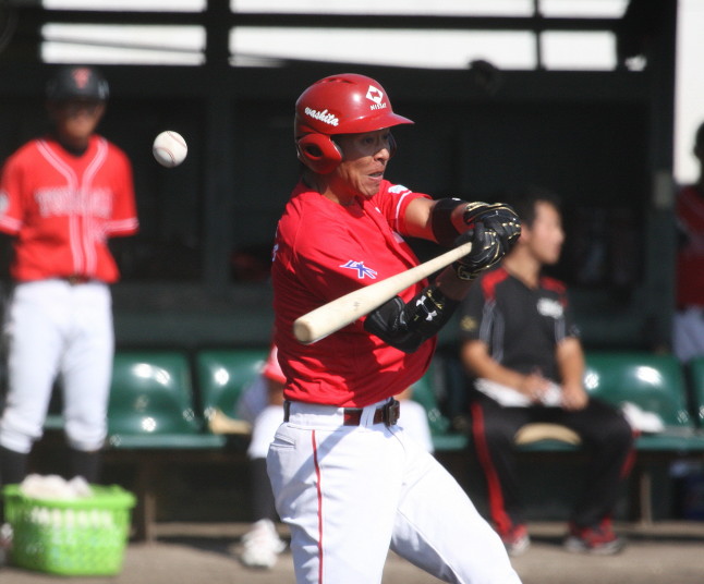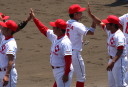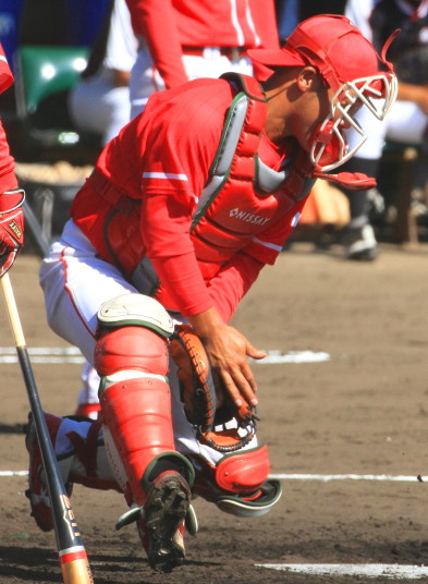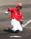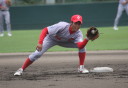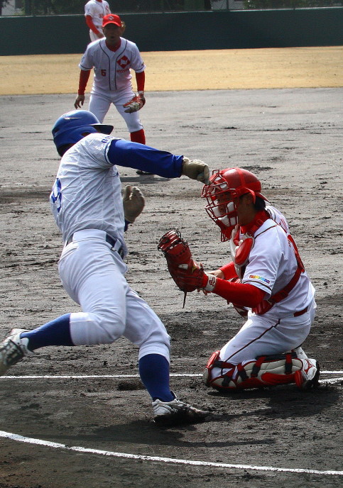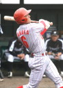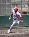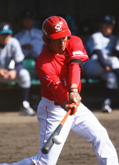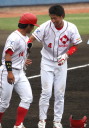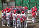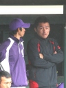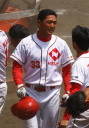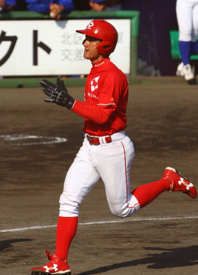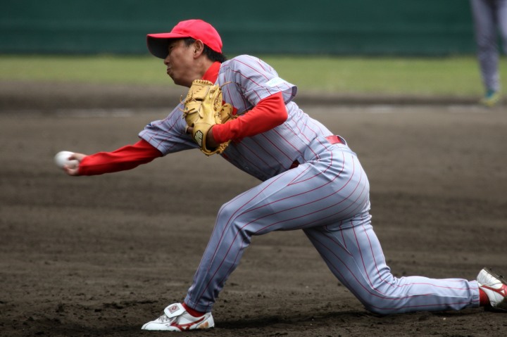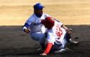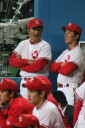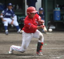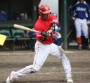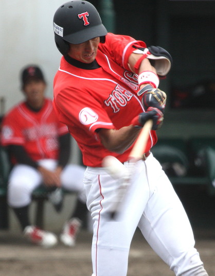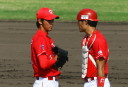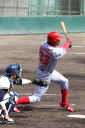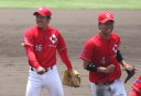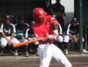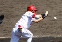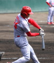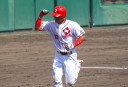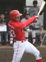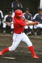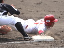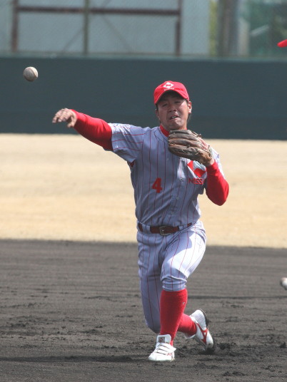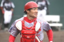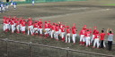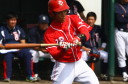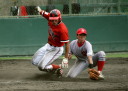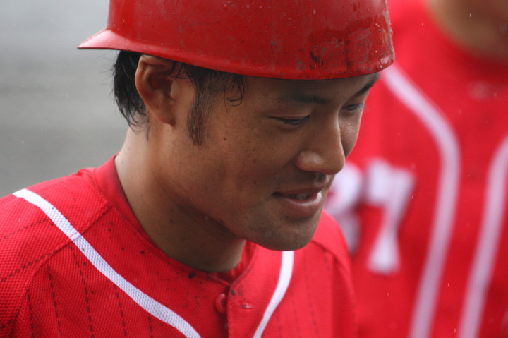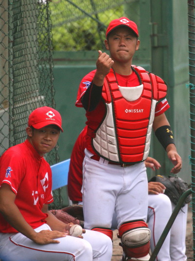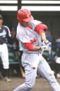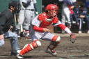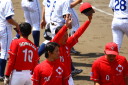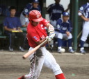 | 想定外のワンサイド・ゲームになった。初回から打線が活発に打ち捲る。 昨年もこのように打ち出すと止まらない状態の時もあった事を思い出した。 7回打者一巡、5安打2四球とタイムリーが続いて一挙5得点が強烈なダメ押しになった。 ただデットボール3個(廣本、山本、原田)は多すぎる、中でも3B山本真は右手甲を負傷し即交代。 余談だが最下段の写真は鳥谷司、阪神の鳥谷敬の弟。現役を退いてマネジャーに専念。 |
