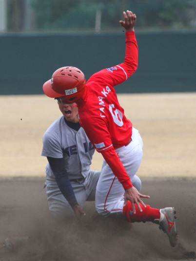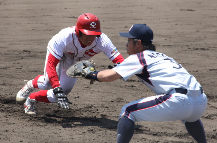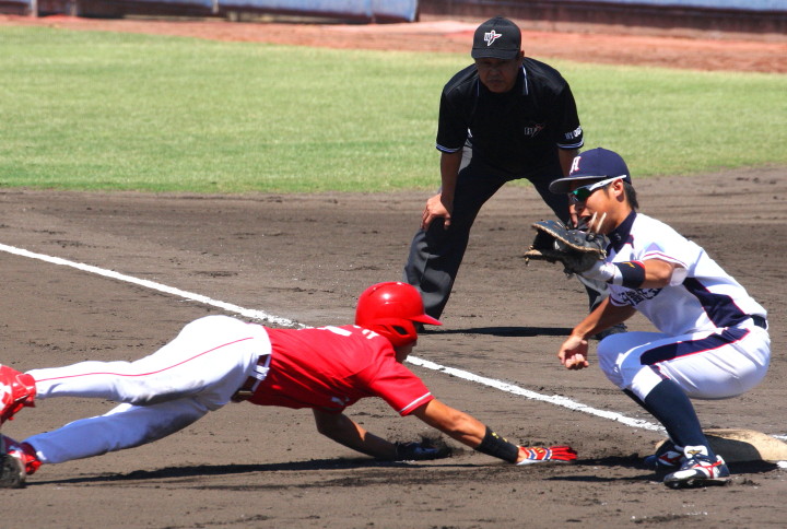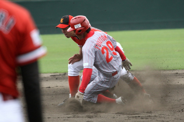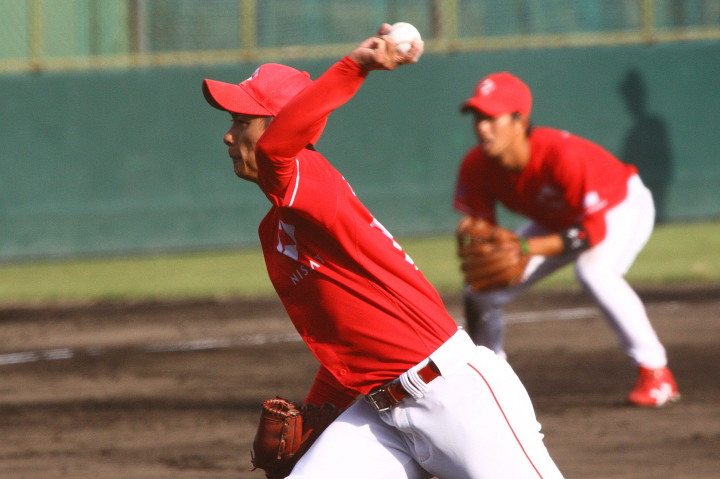 | 先発佐川(7回)、リリーフ清水(2回)が好投、3番高橋のタイムリー、4番上西の犠飛、5番廣本のタイムリーと クリーンアップが持ち分を発揮し3-2の僅差で逃げ切った。明日のリーグ最終戦で準決勝への進出を目指す。 |