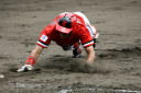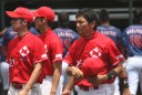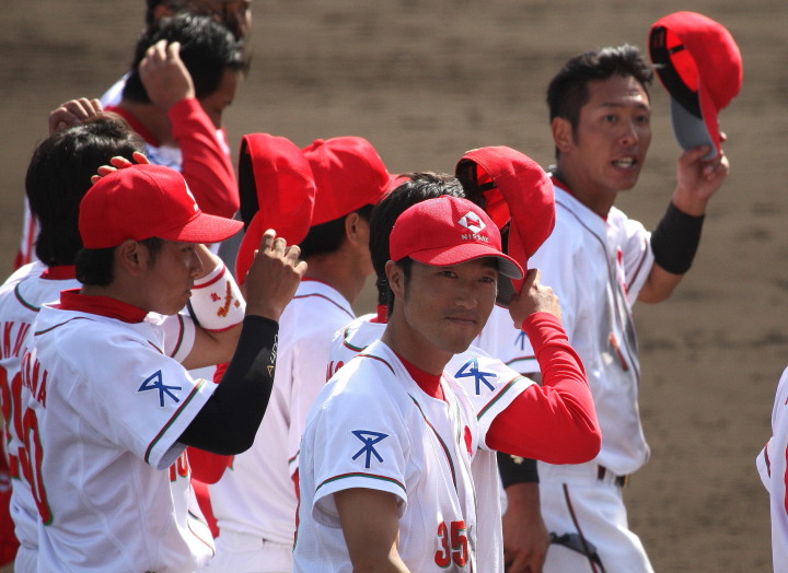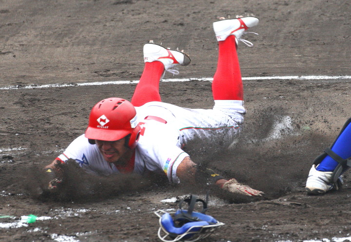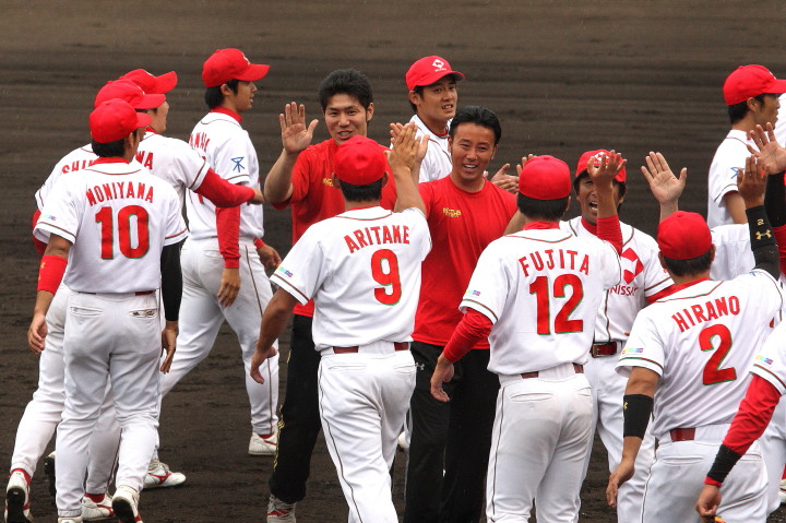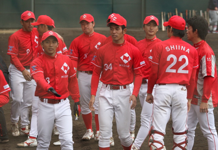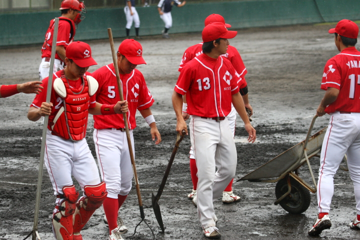 | 都市対抗出場決定後の初の実戦が雨が降り続く悪コンディションの中、予定を30分繰り上げてスタート。 パナソニックから迎えた補強3選手もゲームに出場し全員の雰囲気は最高に佳い。 長距離打者・上西、ベテラン岩下のHRが出て5回終了コールド勝ち。 |