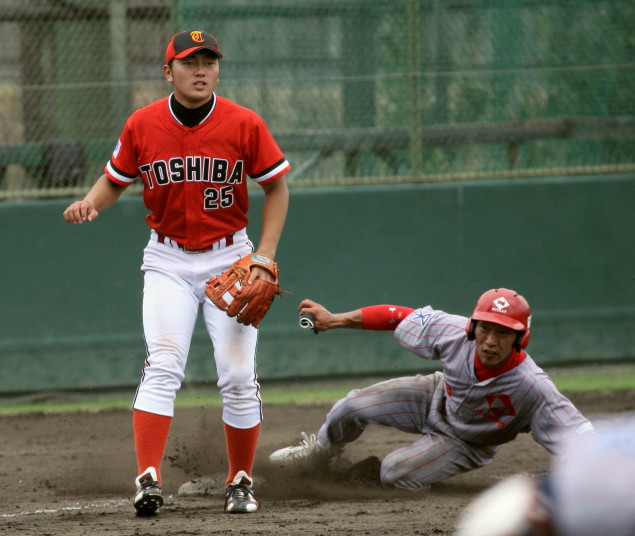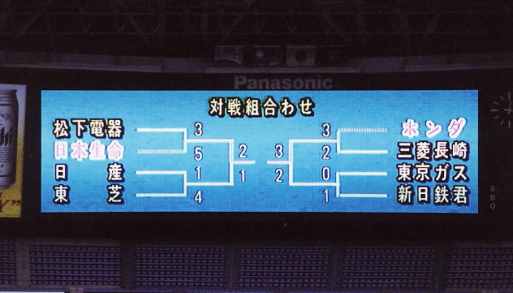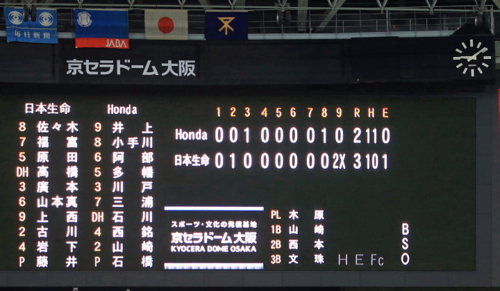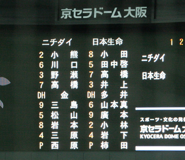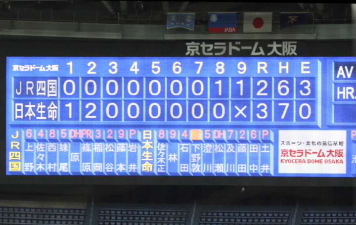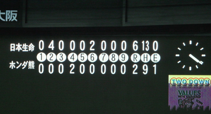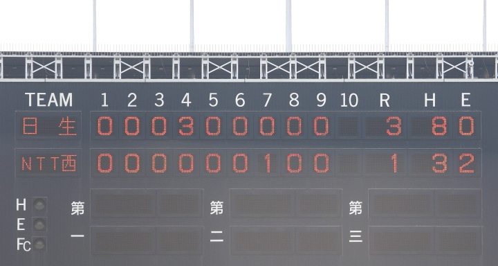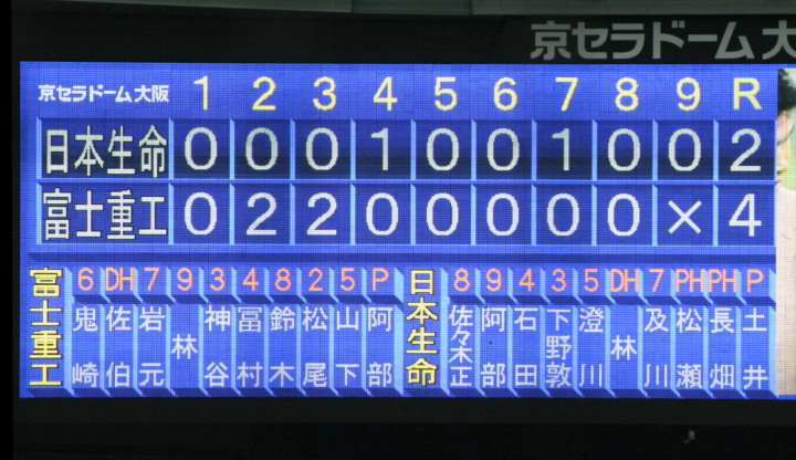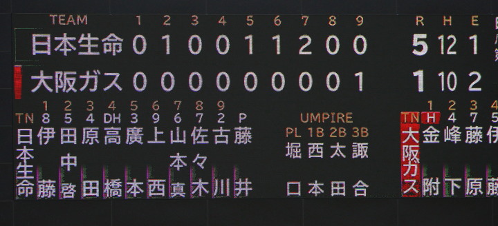| 日本選手権大会出場チームのリーグ戦。 日本生命先発・佐川が8回を零封の好投、余力を残して9回は藤田にバトンタッチ。 2回無死満塁から小林のタイムリーなどで3点を先制。後半再三のチャンスを逃がしたのは残念。 |