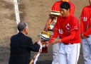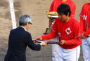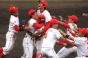 | 遂に決勝戦まで辿り着いた。選手達のモチベーションも最高潮に達し、 ゲーム開始の整列後、日生選手の中から 〜優勝するぞ〜 の叫び声が聞こえた !! スタートから試合の流れが良く4.5回に先行、しかも廣本の2ランが出て勝ちムード。 先発清水は7回までよく踏んだって、終盤小林に繋ぎ、更に山田が最終打者を打ち取り「V10」を達成。 |